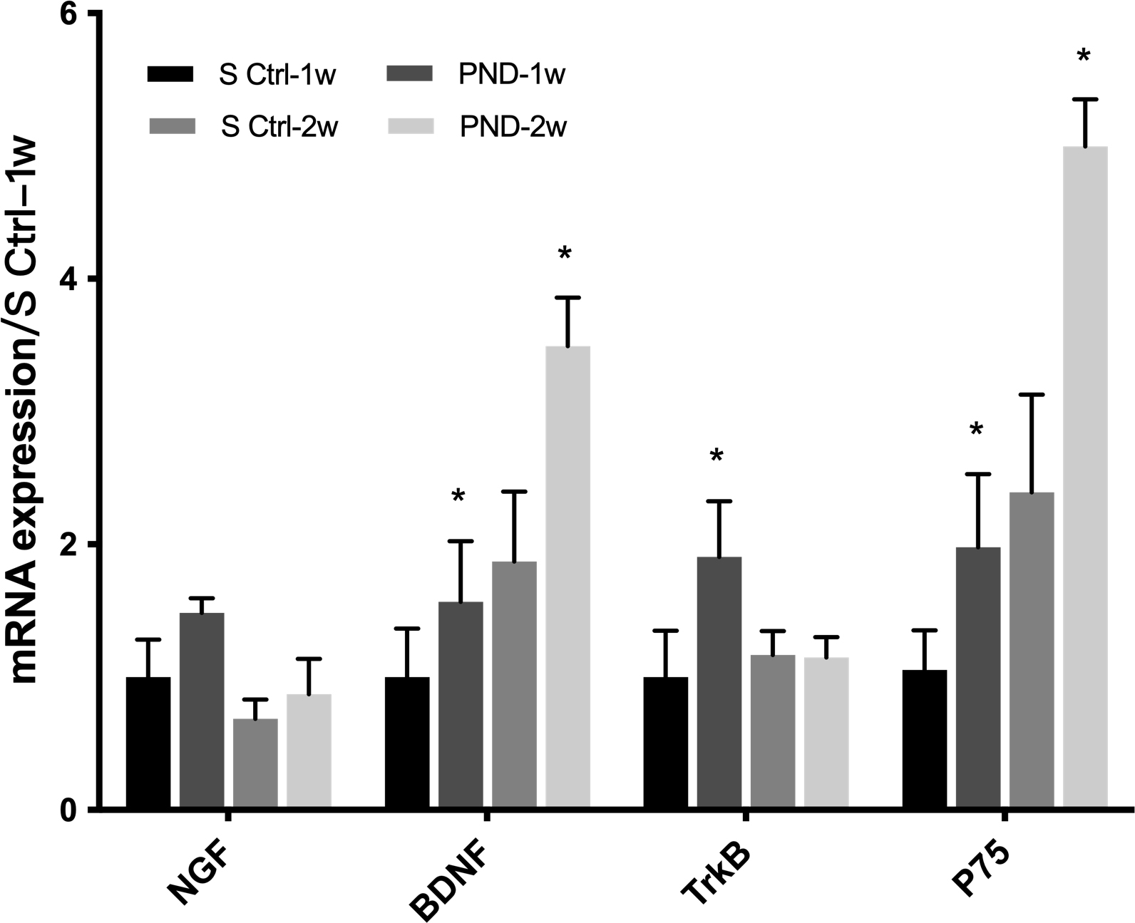 group one and two weeks after injury. The mRNA levels of NGF, BDNF, and their