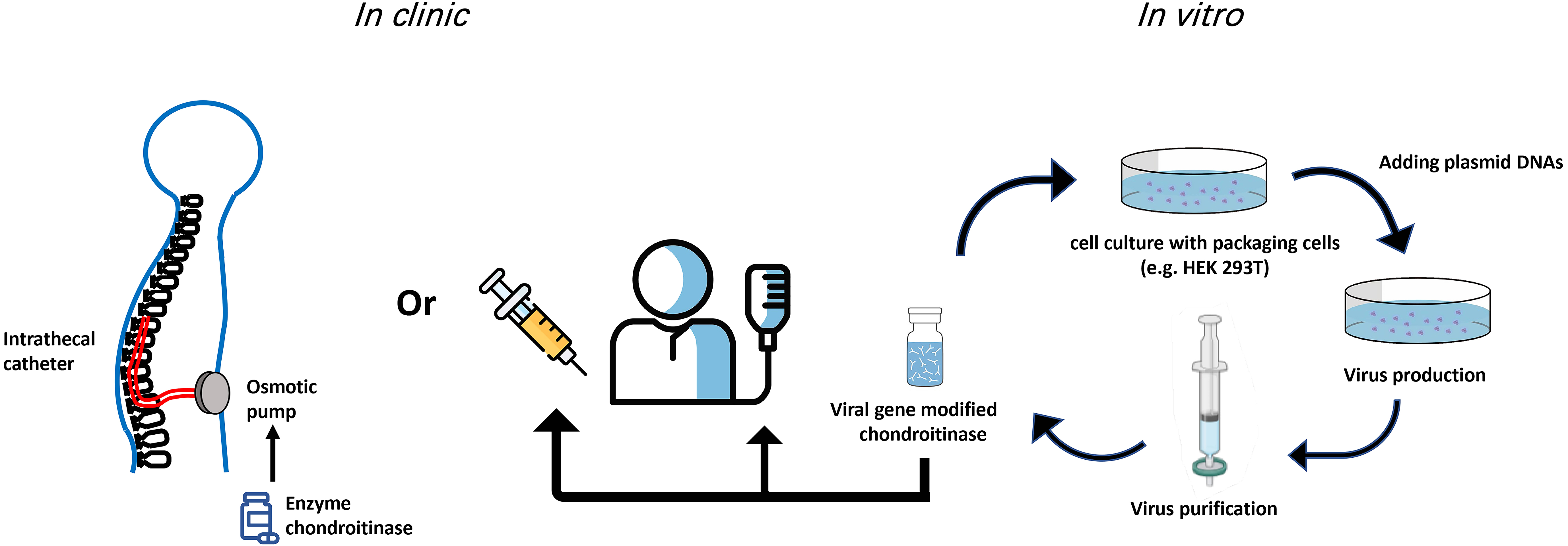 Fig. 1.Potential routes of ChABC administration in the clinic. Both gene therapy and indwelling catheters used for delivery of ChABC have provided viable improvements over single/multiple injections for delivery of the ChABC enzyme. Viral production and delivery of ChABC have the advantage that modifications to the enzyme can be implemented in vitro to temporally modulate expression and secretion of ChABC.