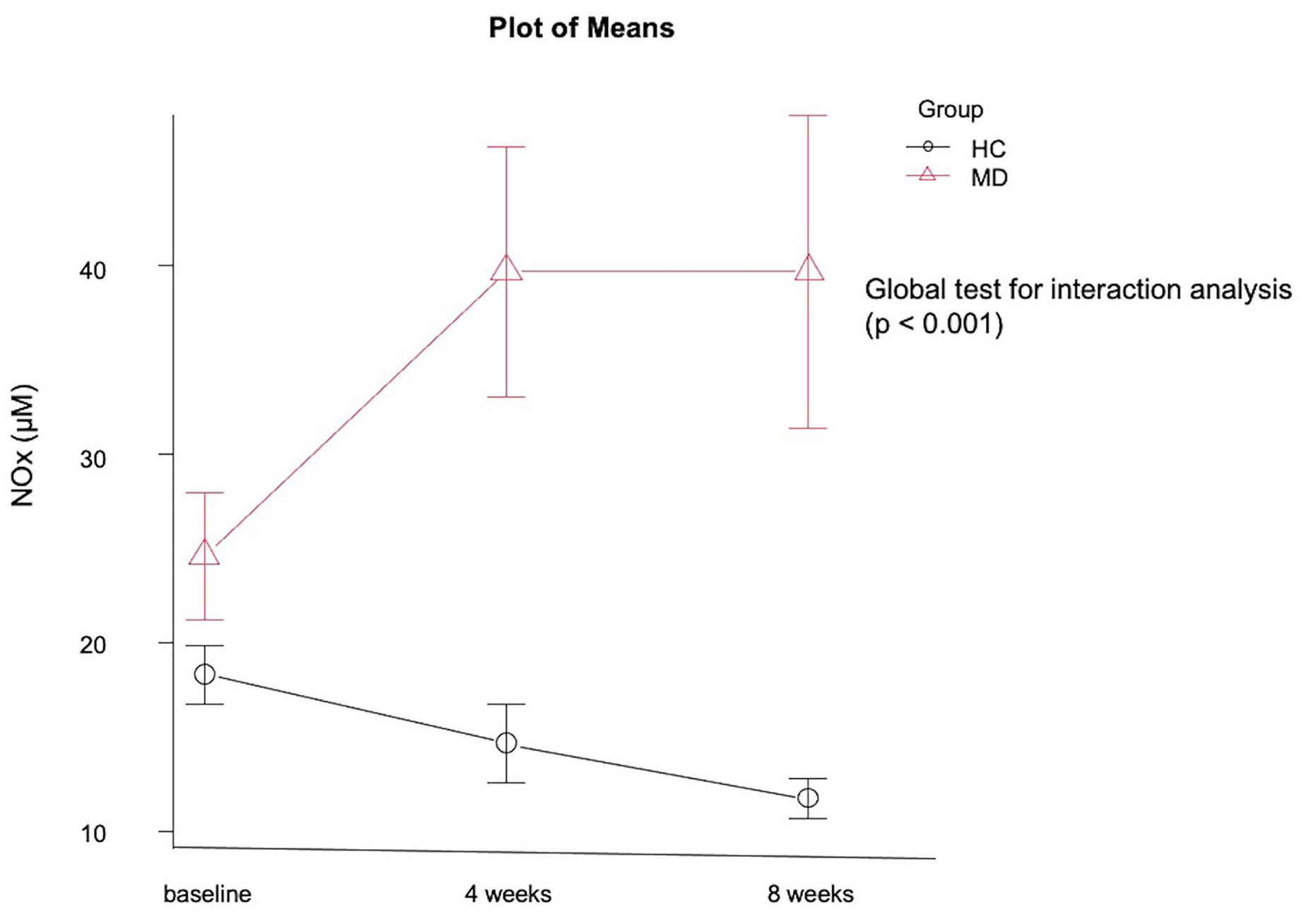 There are controversial reports of both increased [22, 60] and decreased [25, 26, 61, 62] NOx levels in MD. In MD, plasma NOx levels are high, but normalize