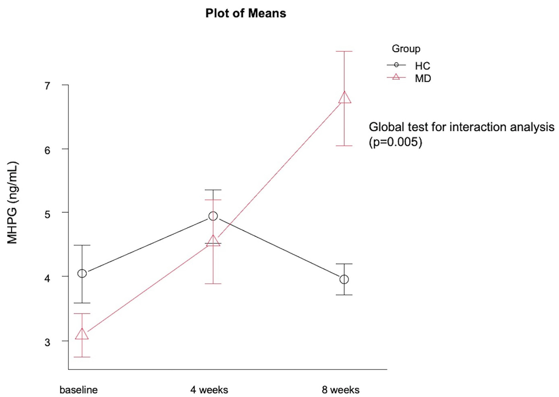 Fig. 2.Course of MHPG after starting exercise therapy. Statistically significant difference in the effect of walking on blood MHPG data in the MD and HC groups at 8 weeks (p = 0.004) after the start of exercise therapy. The bars denote the standard error. MHPG, 3-Methoxy-4-hydroxyphenylglycol; MD, major depression; HC, healthy control; baseline, before starting exercise therapy.