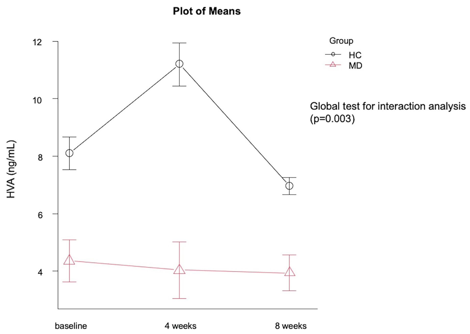 Fig. 3.Course of HVA after starting exercise therapy. Statistically significant difference in the effect of walking on blood HVA data in the MD and HC groups at 4 weeks (p = 0.005) after the start of exercise therapy. The bars denote the standard error. HVA, homovanillic acid; MD, major depression; HC, healthy control; baseline, before starting exercise therapy.