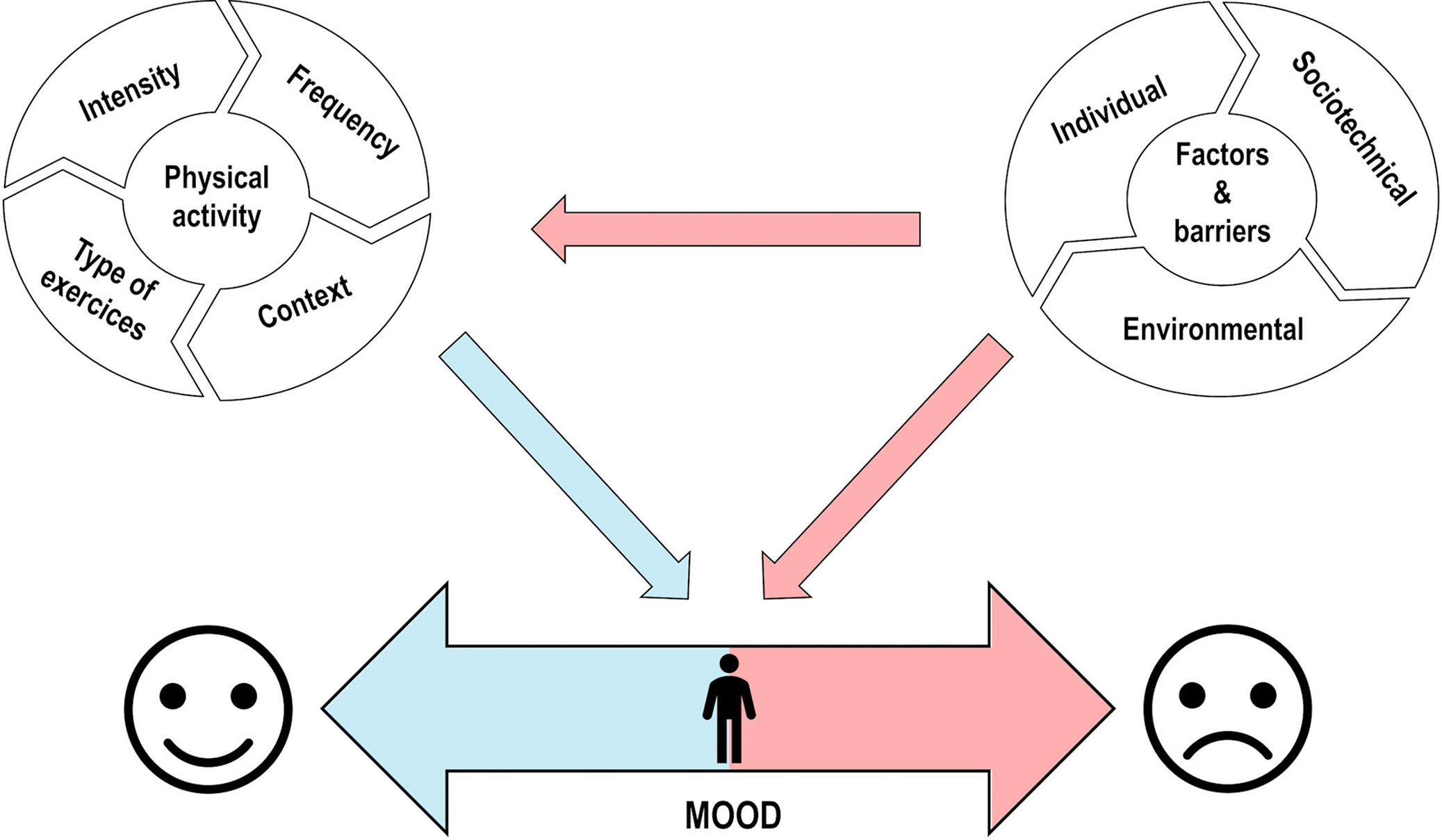 Fig. 1.Interplay between physical activity and external factors on mood. This schematic figure represents the interplay between the effects of physical activity and factors and barriers on mood. The bottom line presents a continuum of mood on which individuals can move to positive affect (left side) or to negative affect (right side). The left circle displays the four factors to consider when designing an exercise program for depressed patients. The blue arrow represents the positive effects that physical activity has on mood. The right circle represents the factors and barriers affecting the engagement of depressed patients in physical activity and exercise (horizontal red arrow) as well as affecting patients’ mood (diagonal red arrow).