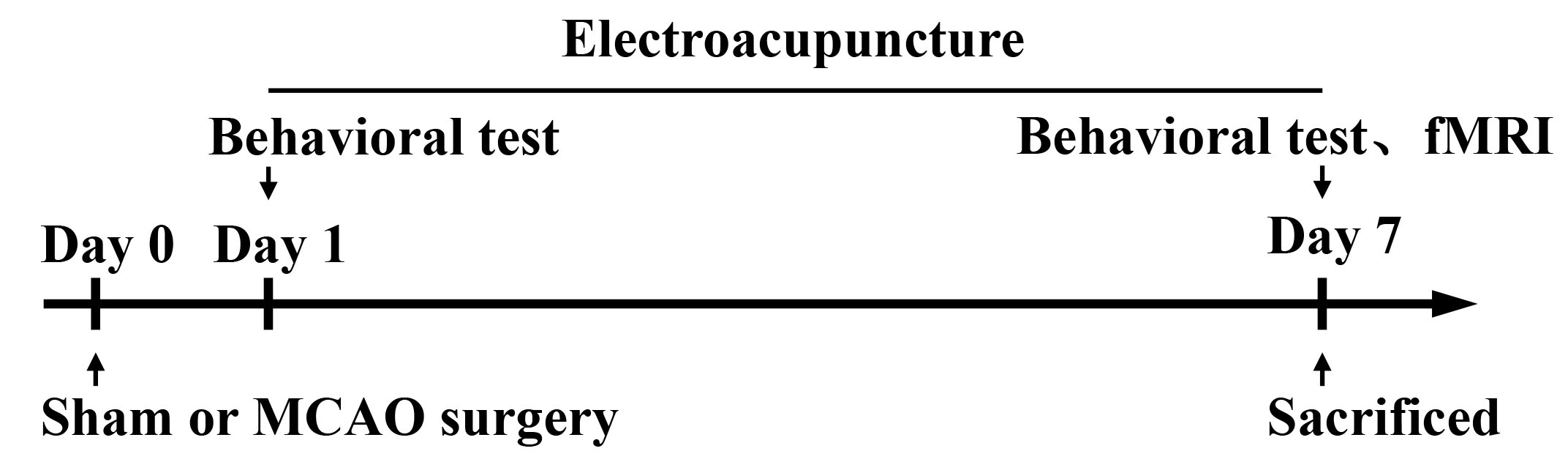Experimental protocol. The MCAO and MCAO + EA were modeled at the beginning. The MCAO + EA group was treated with EA from the 1st day to the 7th day after surgery. Rats in the SC and the MCAO groups received no treatment. The behavioral tests including Zea Longa test and mNSS for all rats were performed before and after treatment for MCAO + EA group. fMRI scans were performed after behavioral tests on the 7th day after surgery. All the rats were sacrificed after the fMRI scan. EA, electroacupuncture; fMRI, functional magnetic resonance imaging; MCAO, middle cerebral artery occlusion; mNSS, modified neurologic severity score; SC, sham-operated control.