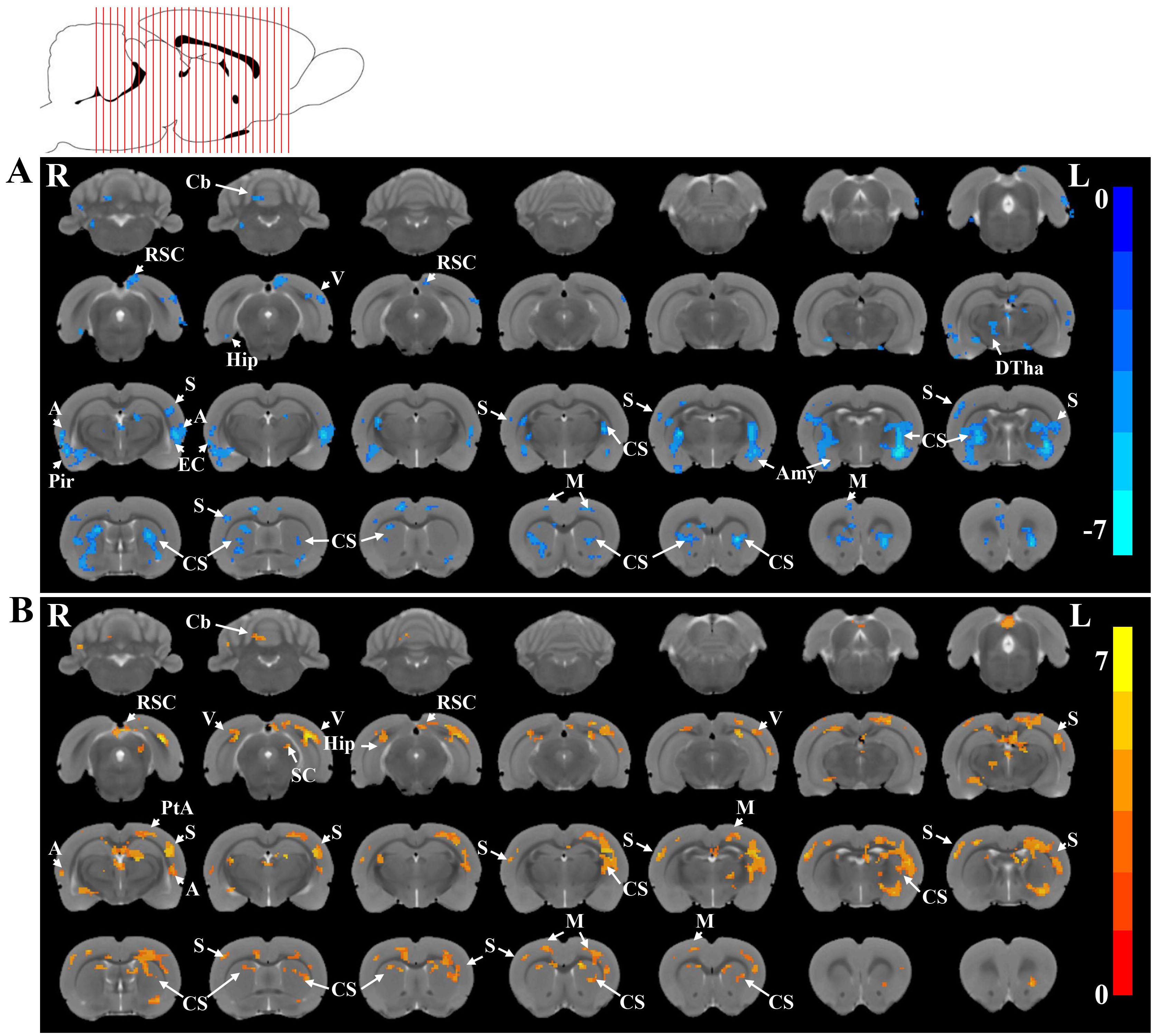 fMRI data were preprocessed using Statistical Parametric Mapping (SPM12, https://www.fil.ion.ucl.ac.uk/spm/) and DATA Processing Assistant for Resting-state fMRI (DPARSF, http://www.restfmri.net/forum/DPARSF). Preprocessing steps included enlarging 10 times of the voxel size, slice-timing correction, realignment for head motion correction, normalization into the standard rat brain atlas, and smoothing with a full-width half maximum of 4 mm. Data were excluded if head movements exceeded 1.0 mm of maximum translation in the x, y, z directions or 2.0 degree maximum rotation in the three axes. Then, the smoothed images were detrended and filtered (0.01–0.08 Hz).