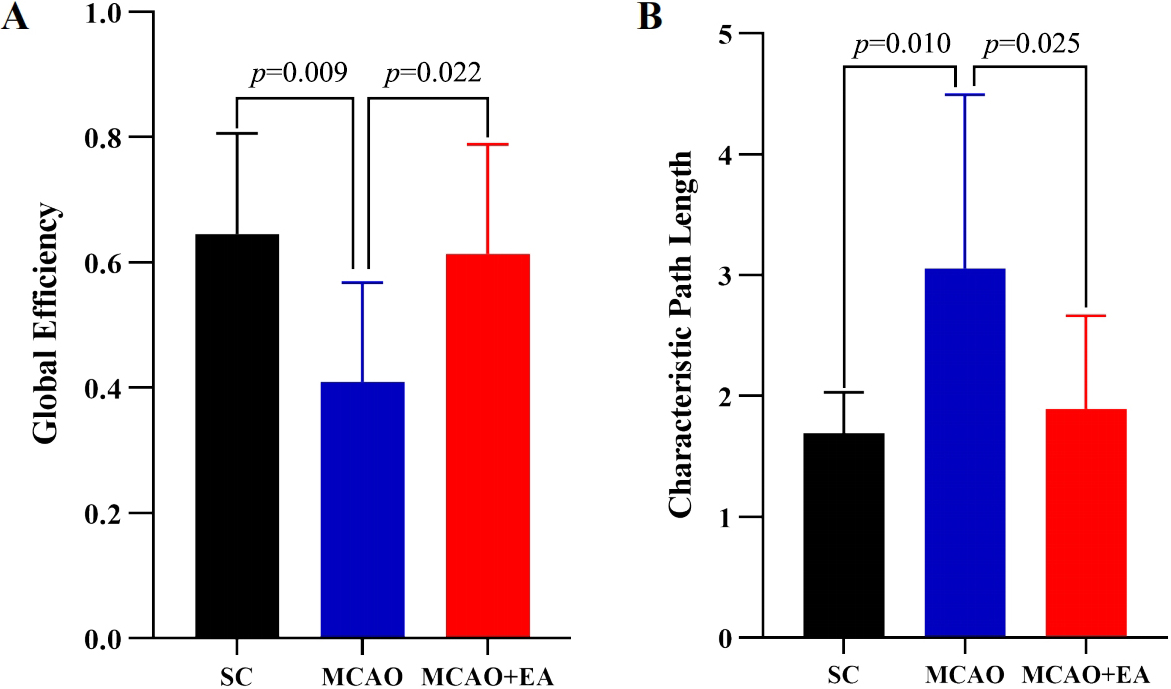 Global graph theoretic measures. Global effificiency (A) and characteristic path length (B) in the SC, MCAO and MCAO + EA groups.