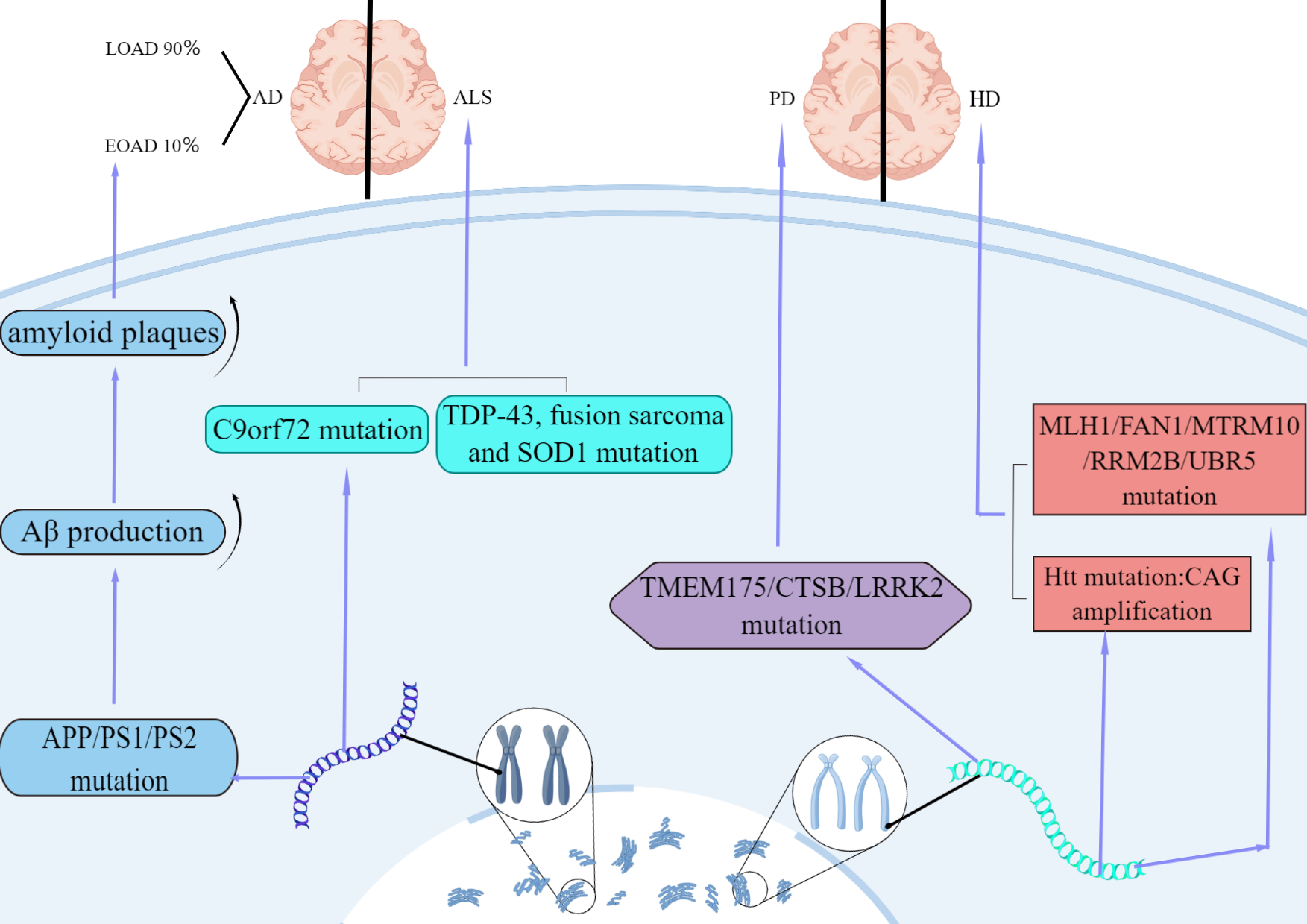 Fig. 1.Features of AD, ALS, HD and PD in genetic factor. AD is divided into early-onset (EOAD) and late-onset (LOAD). 10% of AD cases are