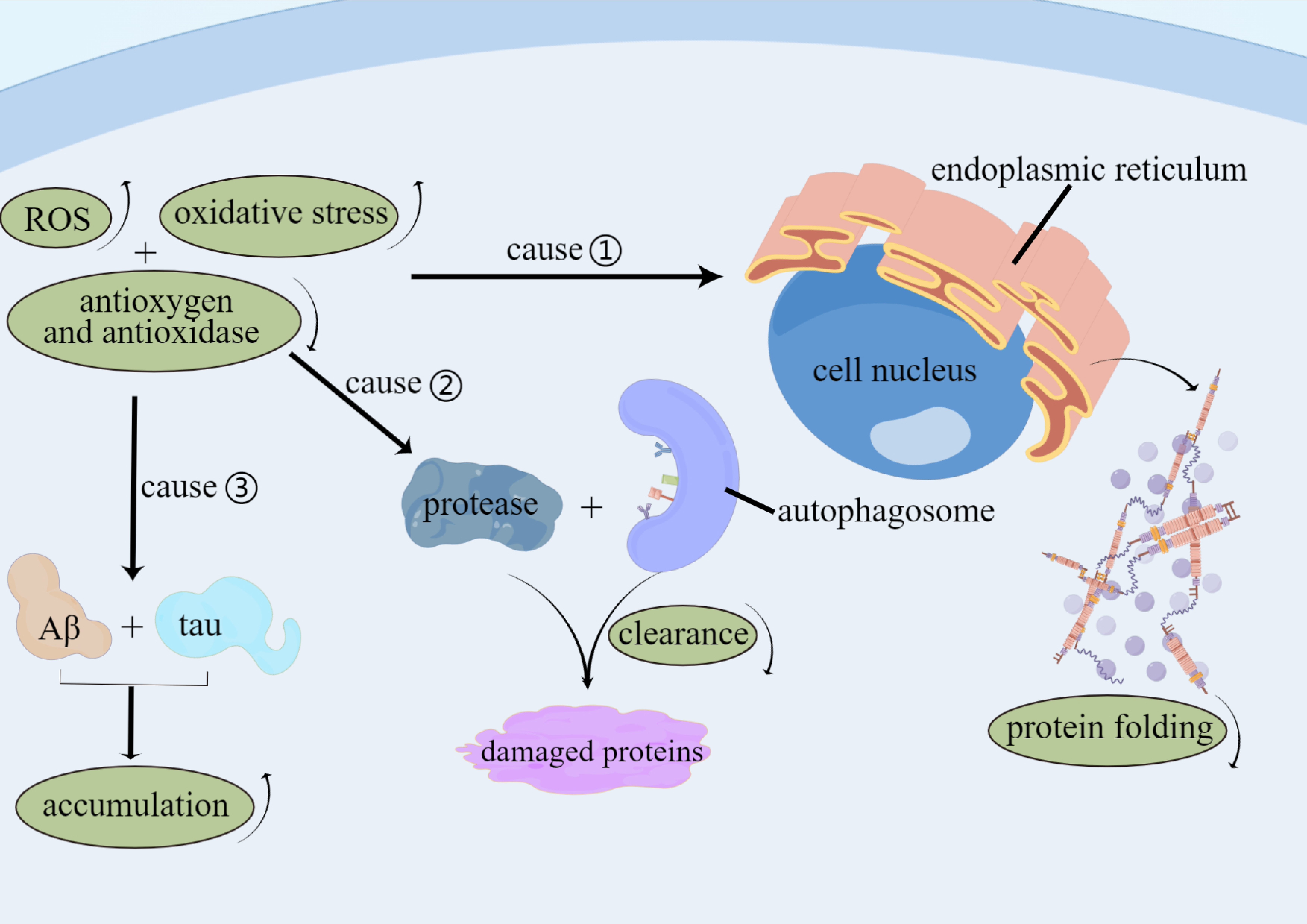 damaged proteins, and increased accumulation of tau proteins and A