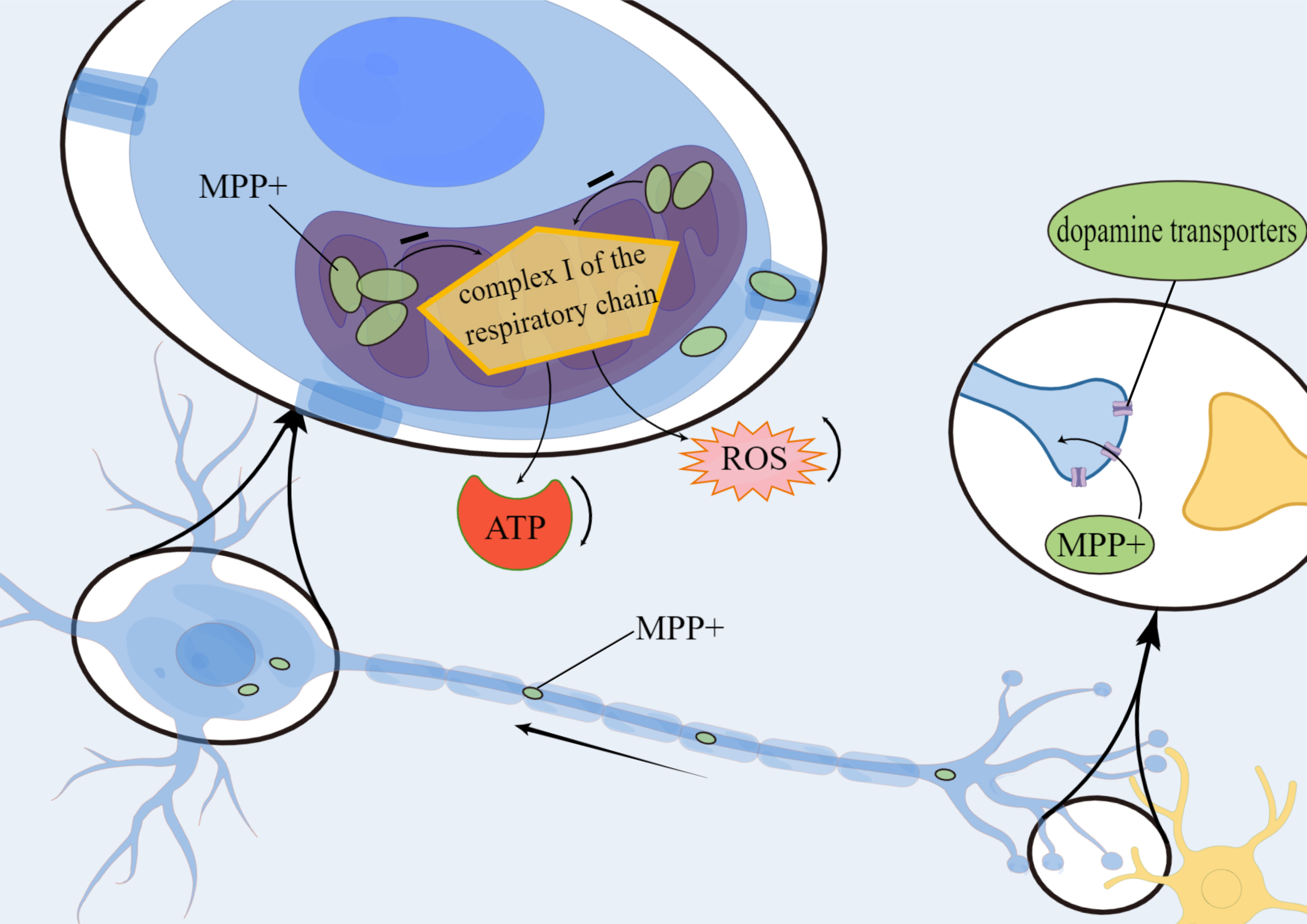 Several lines of evidence suggest that oxidative stress and ROS may be one of the major factors responsible for the progression of neurodegeneration. The neurotoxin metabolite 1-methyl-4-phenylpyridine ion is transported via dopamine transporters to neuronal mitochondria where they accumulate and inhibit complex I activity in the mitochondrial respiratory chain. This leads to a reduction in ATP production and an increase in ROS release, thus resulting in the degeneration of nigrostriatal and striatal dopaminergic neurons (Fig. 3).