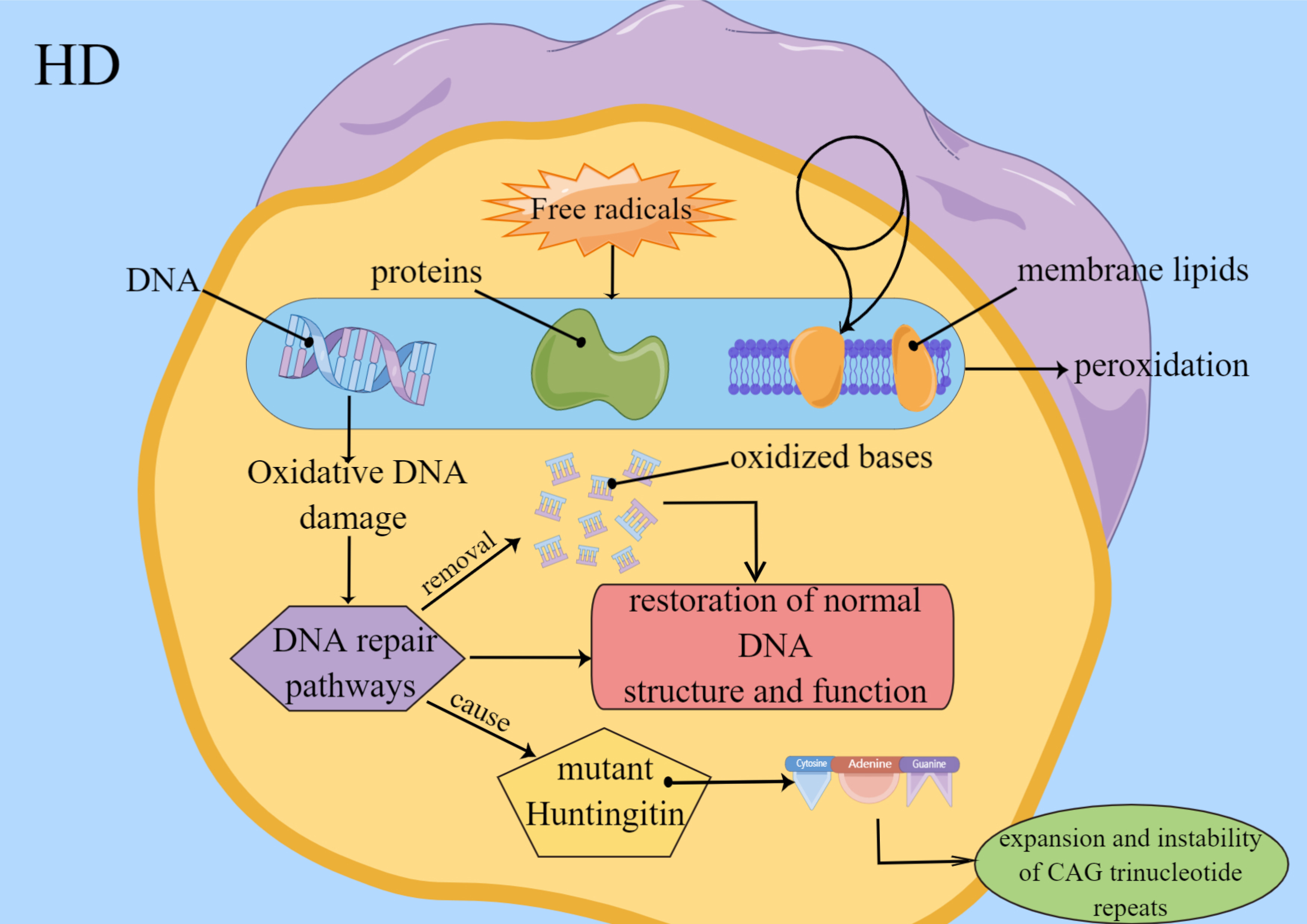 Fig. 4.Factors of Oxidative stress involve in HD. Free radicals lead to peroxidation of DNA, proteins and membrane lipids. Oxidative DNA damage induces DNA repair pathways, and the behavior leads to restoration of normal DNA function and structure. And oxidized bases are removed. Repairment of damaged DNA may cause instability and expansion of CAG trinucleotide repeats in Huntington mutant.