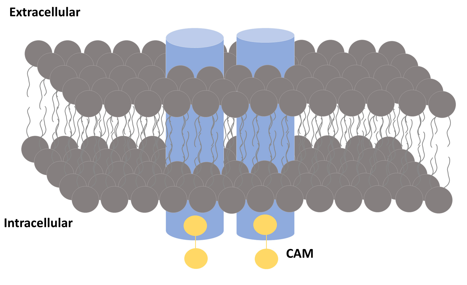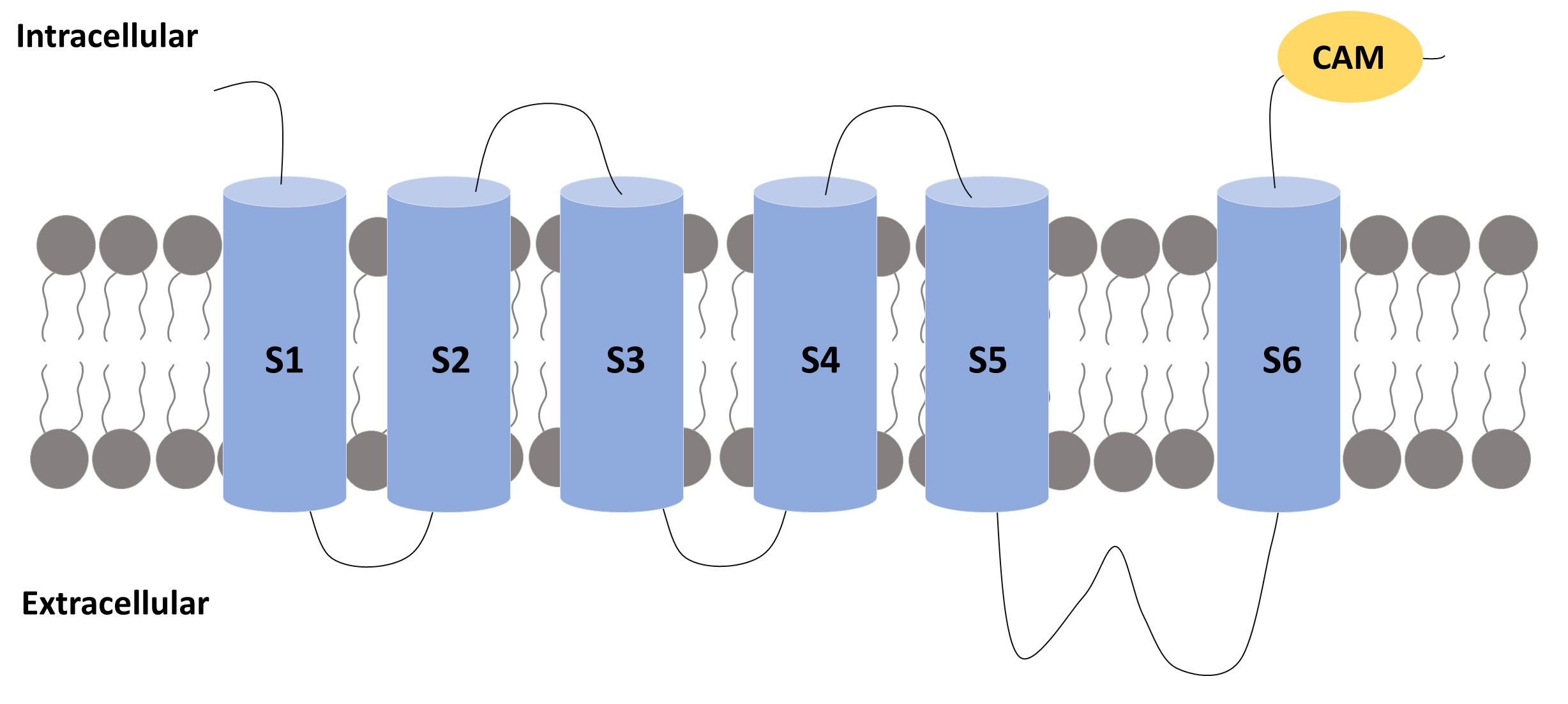 Fig. 1.A general view of an SK channel. An SK channel is formed by four subunits (represented by blue cylinders). Each subunit binds to a calmodulin (CaM) molecule.