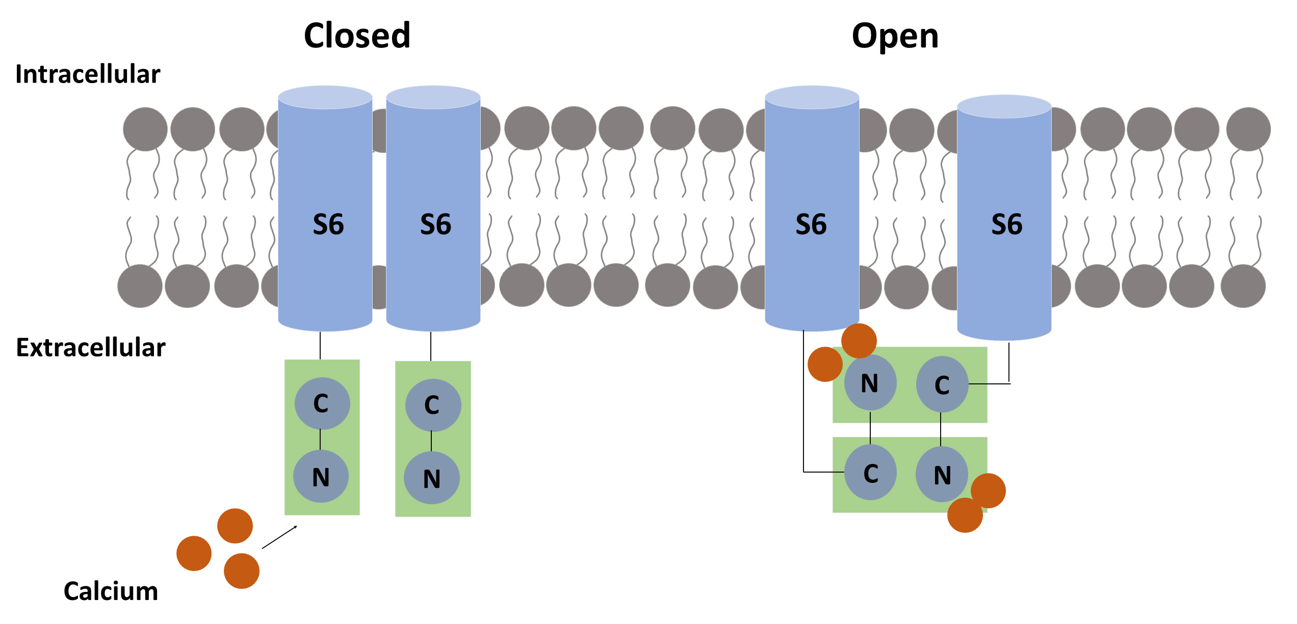 Each CaM molecule binds two calcium ions to activate an SK channel. Biochemical experiments confirmed that the C-terminus interacts with CaM independently of the presence of calcium, while a subdomain only interacts with the C-terminus domain in the presence of calcium [14]. This site on the C-terminus is called the CaM-binding domain (CaMBD) [15].