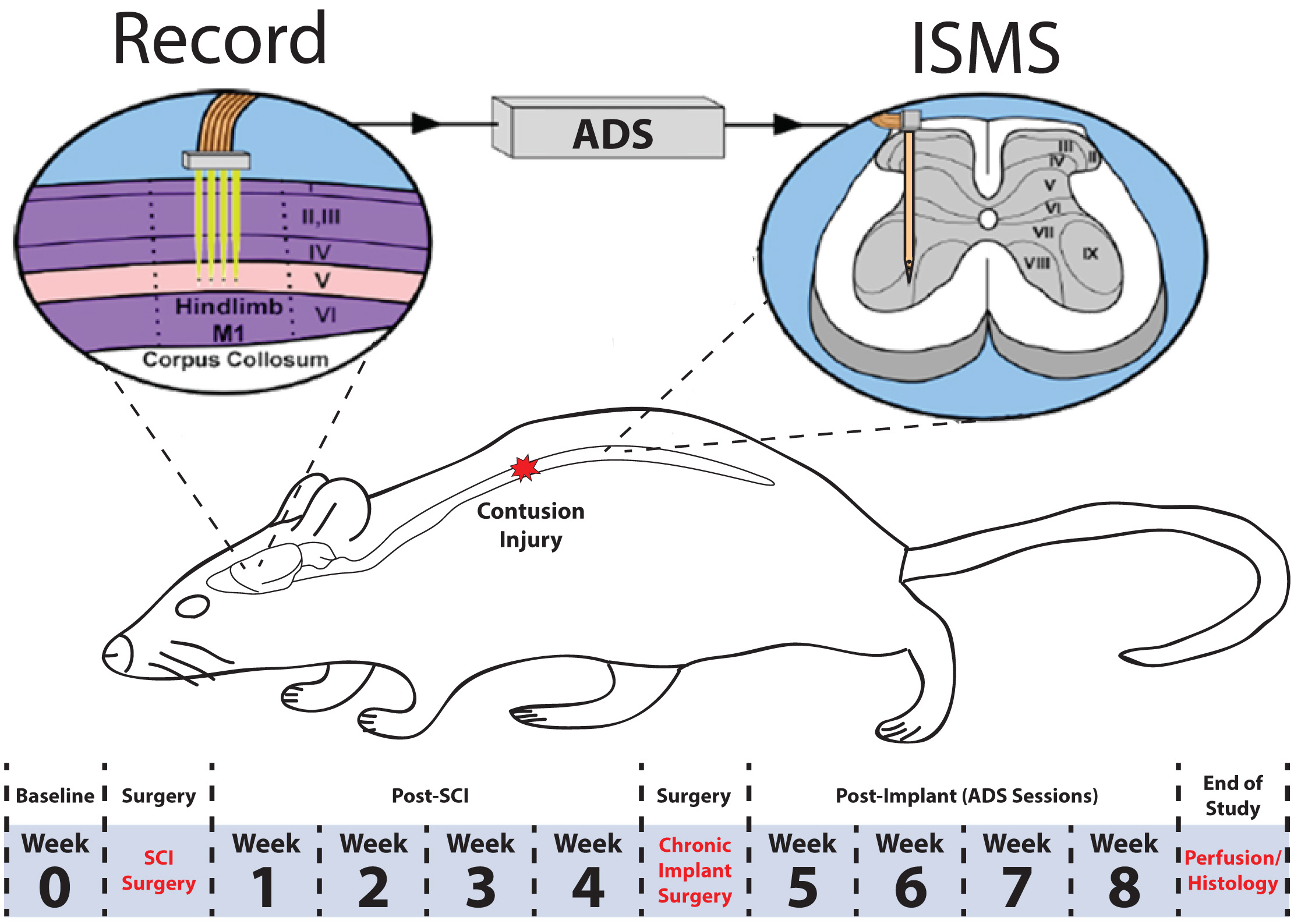 These earlier efforts inspired us to develop an understanding of the connection between the brain and spinal cord after a bilateral thoracic spinal cord contusion that mimics those seen in clinical spinal cord injuries [11, 12, 13, 14]. Using spinal cord injury (SCI) models, we can create neuromodulation protocols that can more easily translate into clinical use for rehabilitation. This framework guided the design of a brain-machine-spinal cord interface (BMSI) that uses ADS to strengthen motor pathways that may still be intact after SCI [15]. ADS administered in a closed-loop manner uses neural activity to trigger stimulation. In our ADS paradigm, an implanted recording microelectrode in the hindlimb motor cortex records and digitizes extracellular neural activity, discriminates individual action potentials in real time, and delivers small amounts of electrical current to another stimulating microelectrode implanted in the ventral horn of the lumbar spinal cord distal to the level of the injury.