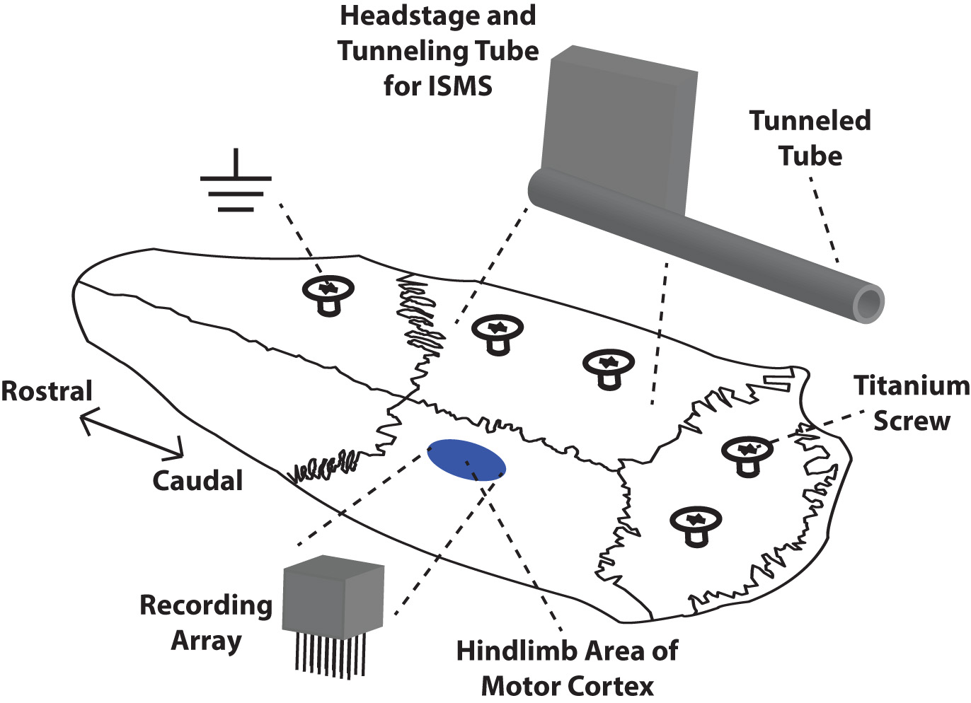Fig. 2.Placement of chronic microelectrode array, headstage, and supporting hardware on the skull of a rat. Dental acrylic was used to build a protective cap and anchor the array and headstage to the skull via five titanium screws. The recording array was implanted in the left hindlimb motor cortex. The headstage for the stimulating electrode was mounted on the right side of the skull while the microwires were tunneled via a tunneling tube to the lumbar spinal cord. The ground wires for both electrodes were wrapped around the rostral-most titanium screw.