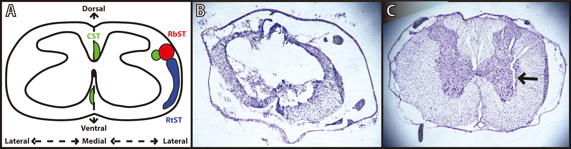 Fig. 3.Verification of spinal cord injury and microwire implantation. (A) Schematic diagram of a coronal thoracic section identifying the location of the descending corticospinal tract (CST; green), rubrospinal tract (RbST; red), and reticulospinal tract (RtST; blue). Reproduced with permission from Roger N. Lemon, Descending Pathwaysin Motor Control; published by Annual Reviews, 2008. [22]; and reproduced with permission from Kathren L. Fink, Reorganization of Intact Descending Motor Circuits to Replace Lost Connections After Injury; published by Springer, 2016. [23]. (B) Representative image of spinal cord injury epicenter under T8 vertebrae stained with cresyl violet 8 weeks after injury. (C) Representative image of microwire implant track under T13 vertebrae stained with cresyl violet 4 weeks after implantation.