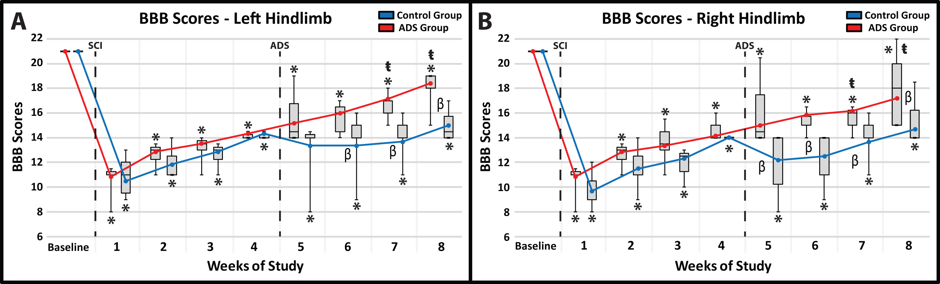 BBB scores improved for each hindlimb in both the ADS and Control group, but