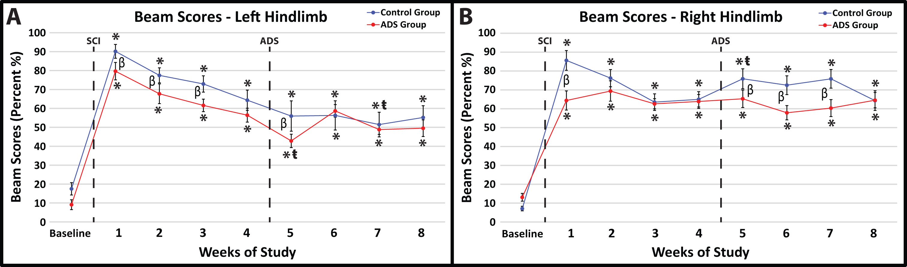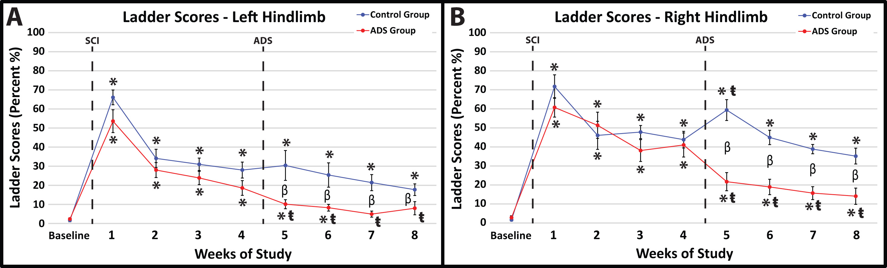 The post-implant BBB scores were significantly higher (better) in the ADS group compared to the Control group in each hindlimb. Specifically, the significant difference between groups for each hindlimb continued at three weeks (Week 7) and four weeks (Week 8) of ADS therapy (Fig. 4A,B). The final BBB scores in the ADS group (i.e., BBB score of ~17–18) represented improvement in toe clearance and in the position of the paw during gait (either parallel throughout the entire gait cycle or parallel only when the toe returns to the ground after the swing phase).