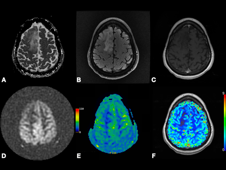 Fig. 1.Right frontal lobe oligodendroglioma (WHO Grade 2). Axial ADC map (A), FLAIR (B), and post-contrast T1-weighted (C) images depicting non-enhancing tumor with T2 prolongation in gray and white matter and increased diffusivity (i.e., shine-through artifact). Axial pcASL source data (D), color-coded CBF map (E) from pcASL data, and color-coded rCBV map (F) from DSC data depicting no hyperperfusion. Abbreviation: ADC, Apparent diffusion coefficient; FLAIR, Fluid attenuated inversion recovery; pcASL, Pseudo-Continuous Arterial Spin Labeling; CBF, cerebral blood flow; rCBV, relative cerebral blood volume; DSC, Dynamic susceptibility contrast MR imaging.