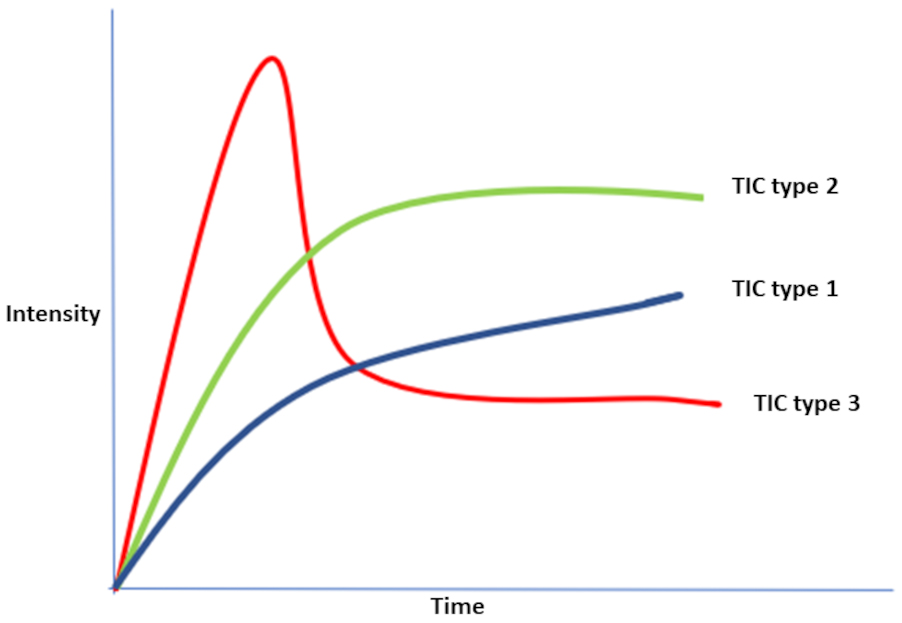 Fig. 4.Illustration showing the three possible types of TIC patterns representing qualitative parameters produced by DCE or GRASP. TIC type (1) represents rapid wash-in followed by continuous persistent enhancement representing slower wash-in without washout, while TIC type (2) demonstrates rapid wash-in followed by a plateau, and TIC type (3) shows rapid wash-in followed by slow washout. Abbreviations: DCE-MRI, dynamic-contrast enhanced MRI; TIC, time intensity curve; GRASP, Golden-Angle Radial Sparse Parallel MR imaging.
