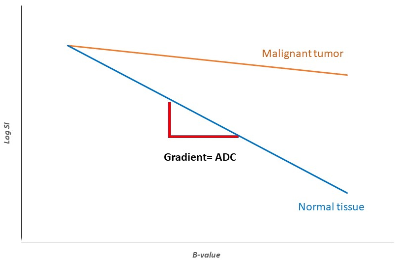 DWI depicts the water molecules’ diffusion in biological tissues, thus allowing diffusion process mapping [32]. It can reflect cellular membrane integrity and tissue cellularity [27]. DWI should be performed at two or more b values (b-value is a factor reflecting the gradients’ time and strength to generate DWI images). Apparent diffusion coefficient (ADC) is a quantitative parameter reflecting water molecules’ diffusion ability [33]. It is derived from the gradient of the signal intensity (SI) log between at least two b-values as illustrated in Fig. 5. In the case of presence of factors restricting water diffusion, the ADC value is decreased [9].
