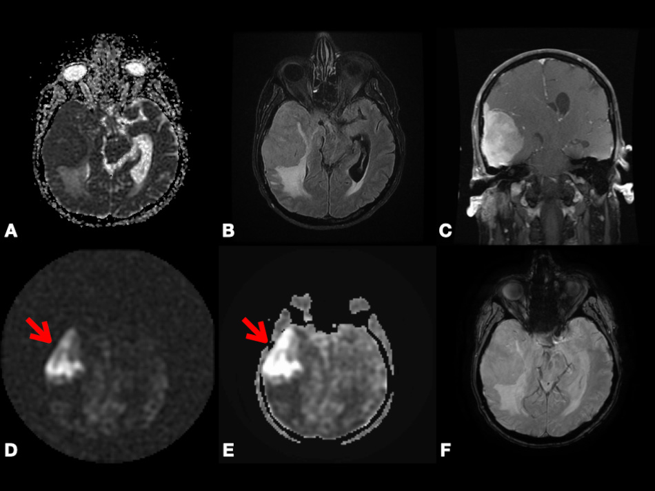 Fig. 6.Right cerebral convexity atypical meningioma (WHO Grade II). Axial ADC map (A), axial FLAIR (B), coronal fat-suppressed post-contrast T1-weighted (C), and axial SWI (F) images depicting large avidly enhancing plaque-like non-calcified mass with dural tail, reduced diffusivity, extensive vasogenic edema and mass effect with uncal herniation and ventricular trapping. Axial pcASL source data (D) and grayscale CBF map (E) depicting marked heterogenous hyperperfusion (red arrows). Abbreviations: ADC, Apparent diffusion coefficient; FLAIR, Fluid attenuated inversion recovery; SWI, Susceptibility weighted imaging; pcASL, Pseudo-Continuous Arterial Spin Labeling; CBF, cerebral blood flow.