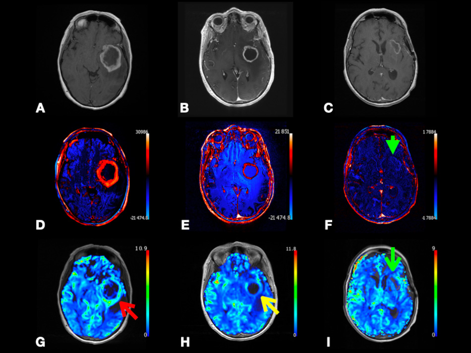 Fig. 7.Left temporal lobe glioblastoma (WHO Grade 4) with false-positive perfusion imaging for recurrence and subsequent treatment-mediated response. Axial post-contrast T1-weighted (A–C), color-coded subtraction maps (D–F), and color-coded rCBV maps (G–I) from DSC data. Baseline images (A,D,G) depicting enhancing mass with central necrosis and peripheral hyperperfusion (red arrow). Images obtained four months later (B,E,H) depicting enhancement and hyperperfusion (yellow arrow) concerning for recurrence; subsequent redo resection with treatment effect and no tumor on pathology. Images obtained eight months later (C,F,I) after temozolomide and Avastin depicting T1 shortening, resolved enhancement (green arrowhead), and resolved hyperperfusion (green arrow) at the superior margin of the expanded resection cavity compatible with treatment response. Abbreviations: rCBV, relative cerebral blood volume; DSC, Dynamic susceptibility contrast MRI.