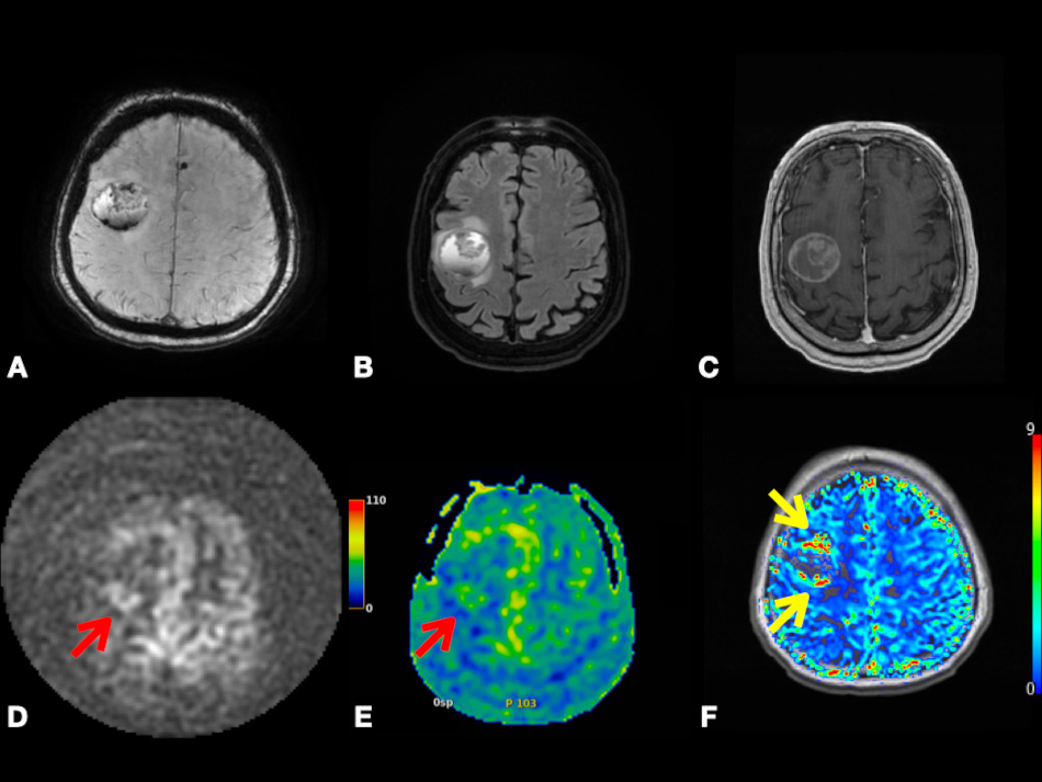 Fig. 8.Right frontal lobe non-small cell lung cancer metastasis. Axial SWI (A), FLAIR (B), and post-contrast T1-weighted (C) images depicting lesion with heterogenous enhancement, perilesional vasogenic edema, central necrosis, and intralesional hemorrhage. Axial pcASL source data (D), color-coded CBF map (E) from pcASL data, and color-coded rCBV map (F) from DSC data depicting heterogenous hyperperfusion amongst nodules at super lesion margin (red arrowheads) and enhancing margins elsewhere (yellow arrowheads). Abbreviations: SWI, Susceptibility weighted imaging; FLAIR, Fluid attenuated inversion recovery; pcASL, Pseudo-Continuous Arterial Spin Labeling; CBF, cerebral blood flow; rCBV, relative cerebral blood volume; DSC, Dynamic susceptibility contrast MR imaging.