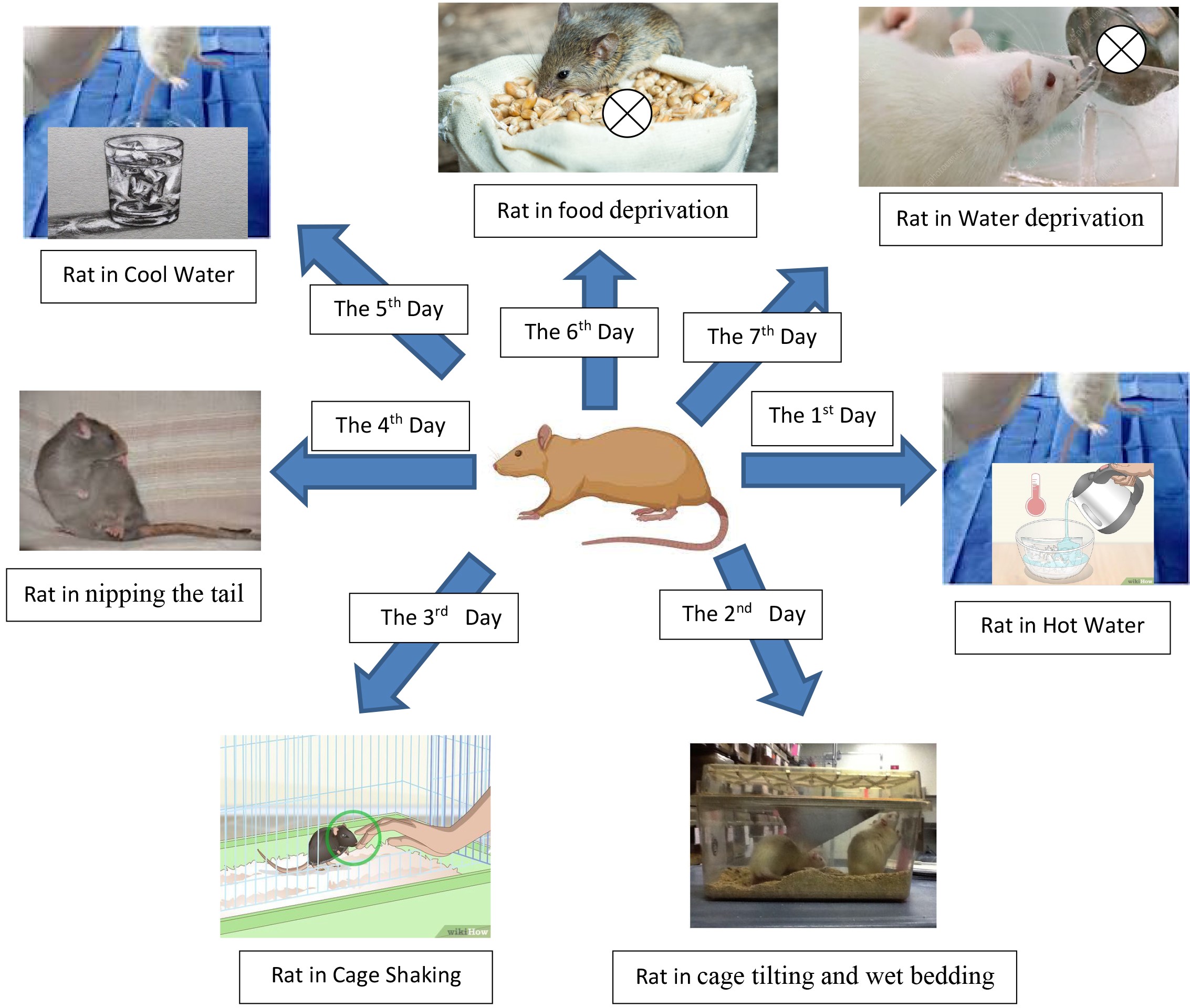 Fig. 1.Chronic mild stress (CMS) induction. Summarize the program for chronic mild stress induction as follows: The first day involved forced swimming in hot water (45 °C for 5 minutes); the second day cage tilting and wet bedding; the third day animal shaking for 10 minutes; the fourth day nipping the tail for 1 minute; the fifth day involved forced swimming in cool (4 °C for 5 minutes); the sixth day food deprivation for 24 hours and overnight illumination; the seventh day water deprivation for 24 hours and all the above aforementioned stressors were applied once a week for 6 weeks.