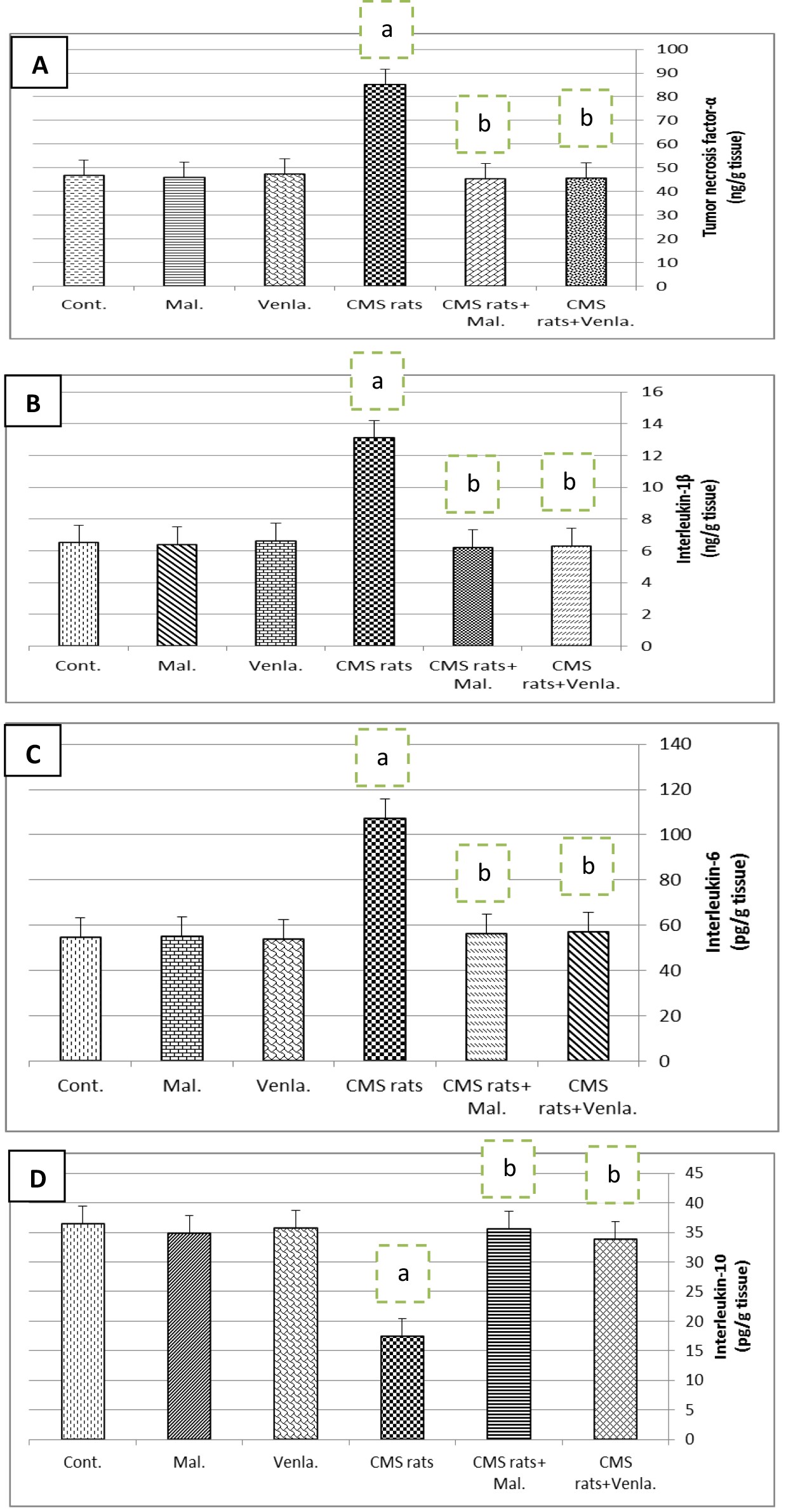 | Parameters | Control | Malic acid | Venlafaxine drug | CMS rats | CMS rats + Malic acid | CMS rats + Venlafaxine |