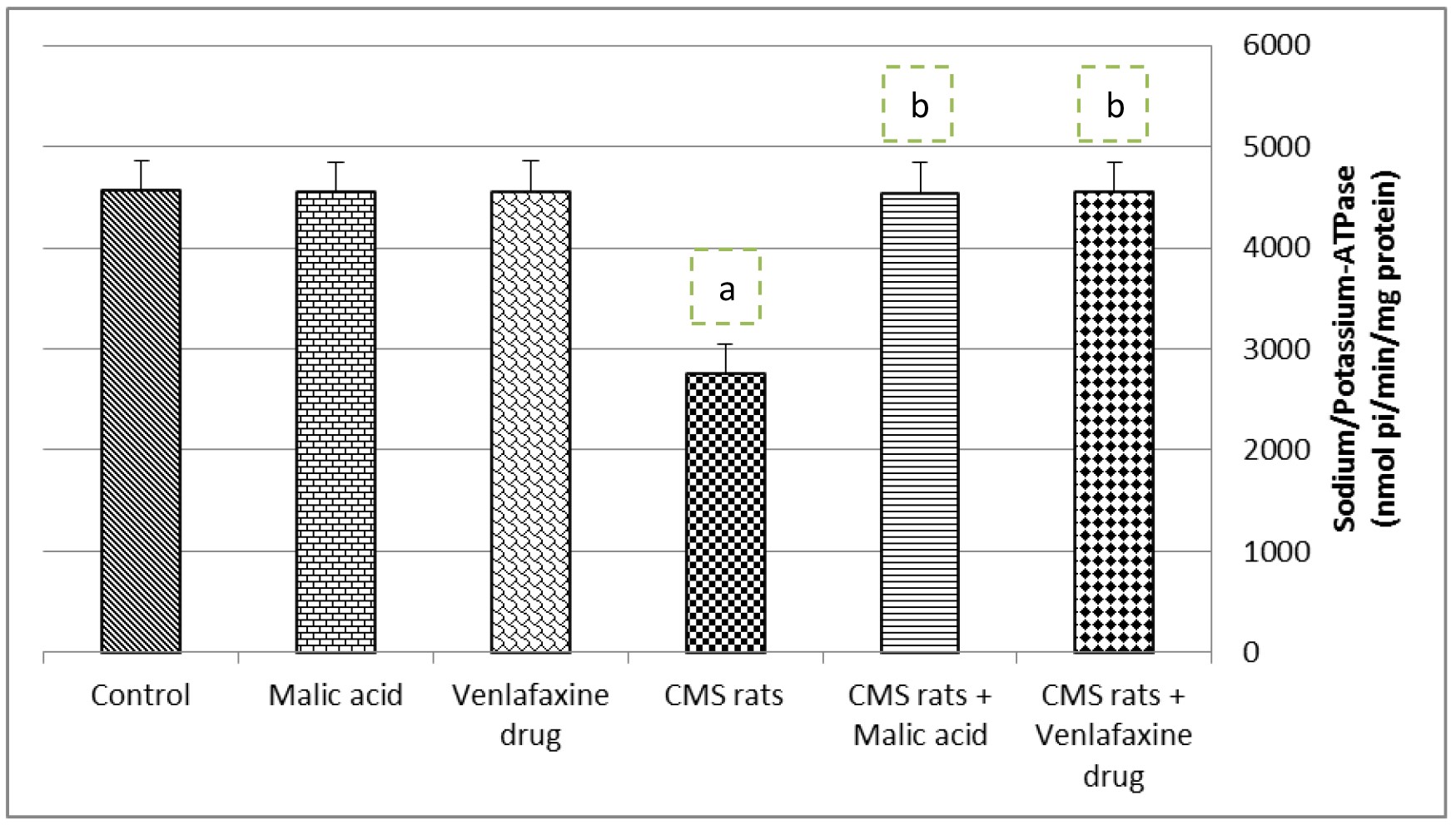 Thirty-six male albino rats were divided into 6 equal groups (6 rats/group) as follows: Control group: normal rats were administered orally with 1 mL of saline solution. Malic acid-treated group: normal rats were administered orally with 250 mg/kg of malic acid [27] dissolved in 1 mL distilled water. This dose increases the motor activity and excitatory processes in the sensory motor brain areas. This dose increases carbohydrate reserves and decreases oxygen consumption of the brain tissues [27]. Venlafaxine drug-treated group: normal rats were administered orally with 20 mg/kg of the venlafaxine drug [28] dissolved in 1 mL distilled water. CMS group: CMS animals were administered orally with 1 mL of saline solution. CMS + malic acid (250 mg/kg)-treated group: CMS rats were administered orally with malic acid (250 mg/kg of malic acid dissolved in 1 mL water). CMS + Venlafaxine drug (20 mg/kg)-treated group: CMS rats were administered orally with 20 mg/kg of Venlafaxine drug dissolved in 1 mL distilled water.