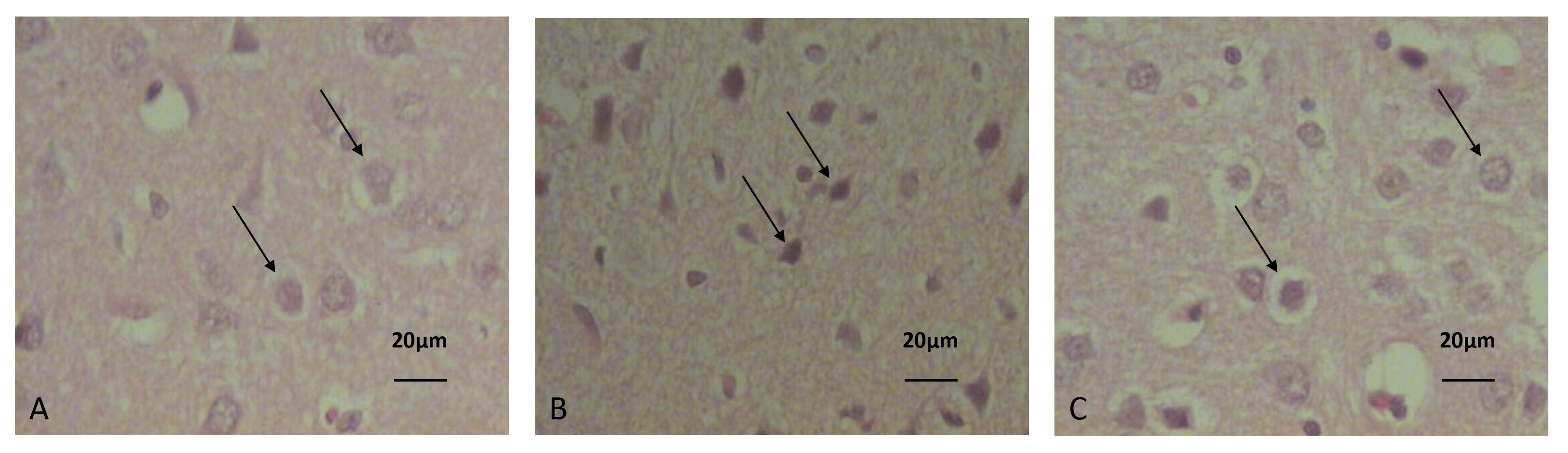 Fig. 6 reveals hypothalamus tissue in the control group, showing the control neurons with large nuclei (pale-stained neurons) (black arrows) (Fig. 6A). Hypothalamus sections of the CMS rats showed small cells that were missing the normal large cells and their normal nuclei. These small cells appear as rings and these neurons contain newly dark dead neurons (black arrows) (Fig. 6B). CMS rats treated with malic acid (250 mg/kg bw) or venlafaxine drug (20 mg/kg bw) showed large normal neurons with normal nuclei that looked like the control group (Fig. 6C).