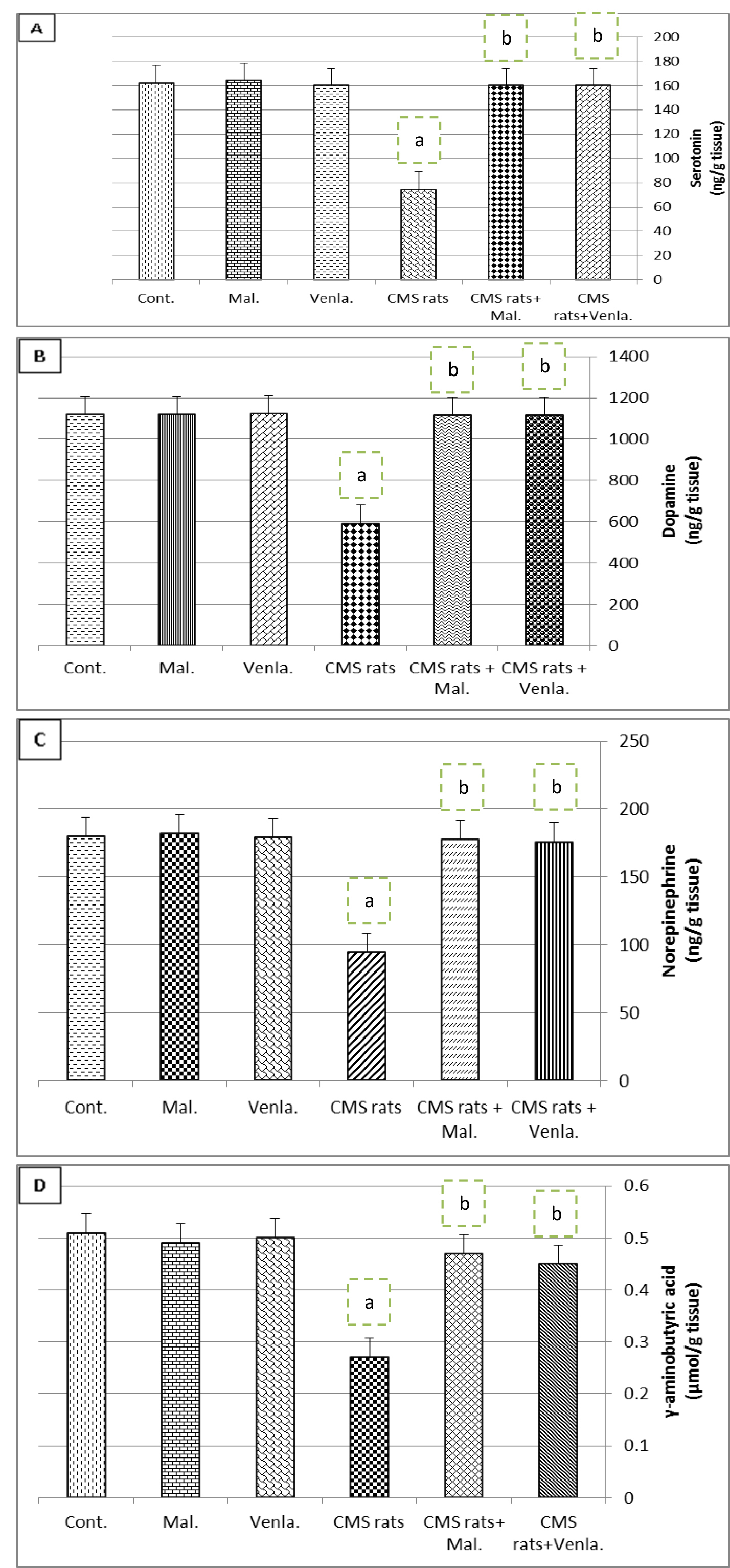 | Parameters | Control | Malic acid | Venlafaxine drug | CMS rats | CMS rats + Malic acid | CMS rats + Venlafaxine |