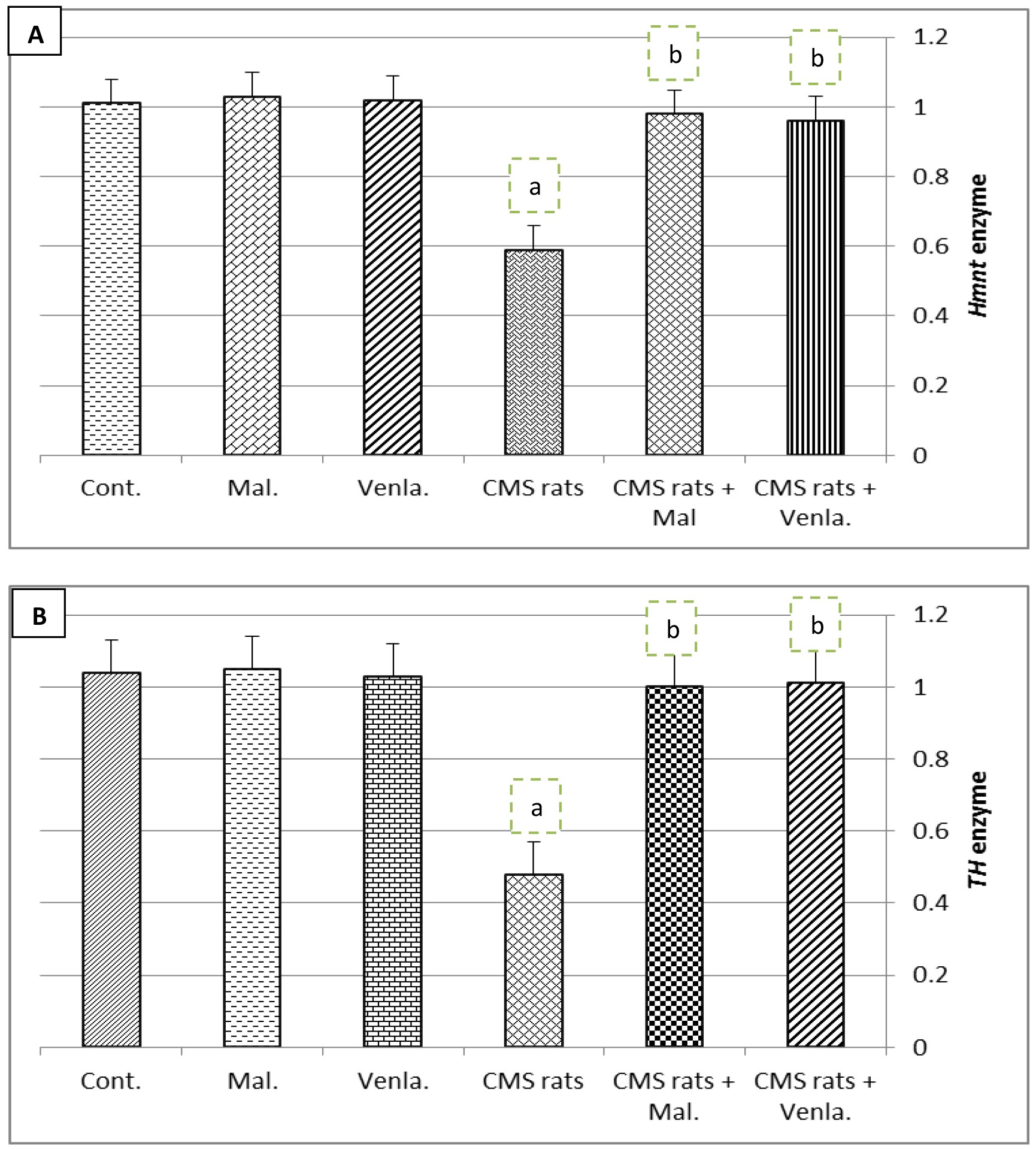 This study aims to study the anti-depressant activity of malic acid through modifying animal behavior, neurotransmitters, oxidative stress, inflammation, sodium/potassium-ATPase activity, and histamine-N-methyl transferase (Hmnt) and tyrosine hydroxylase (TH) enzymes in the hypothalamus of CMS rats.