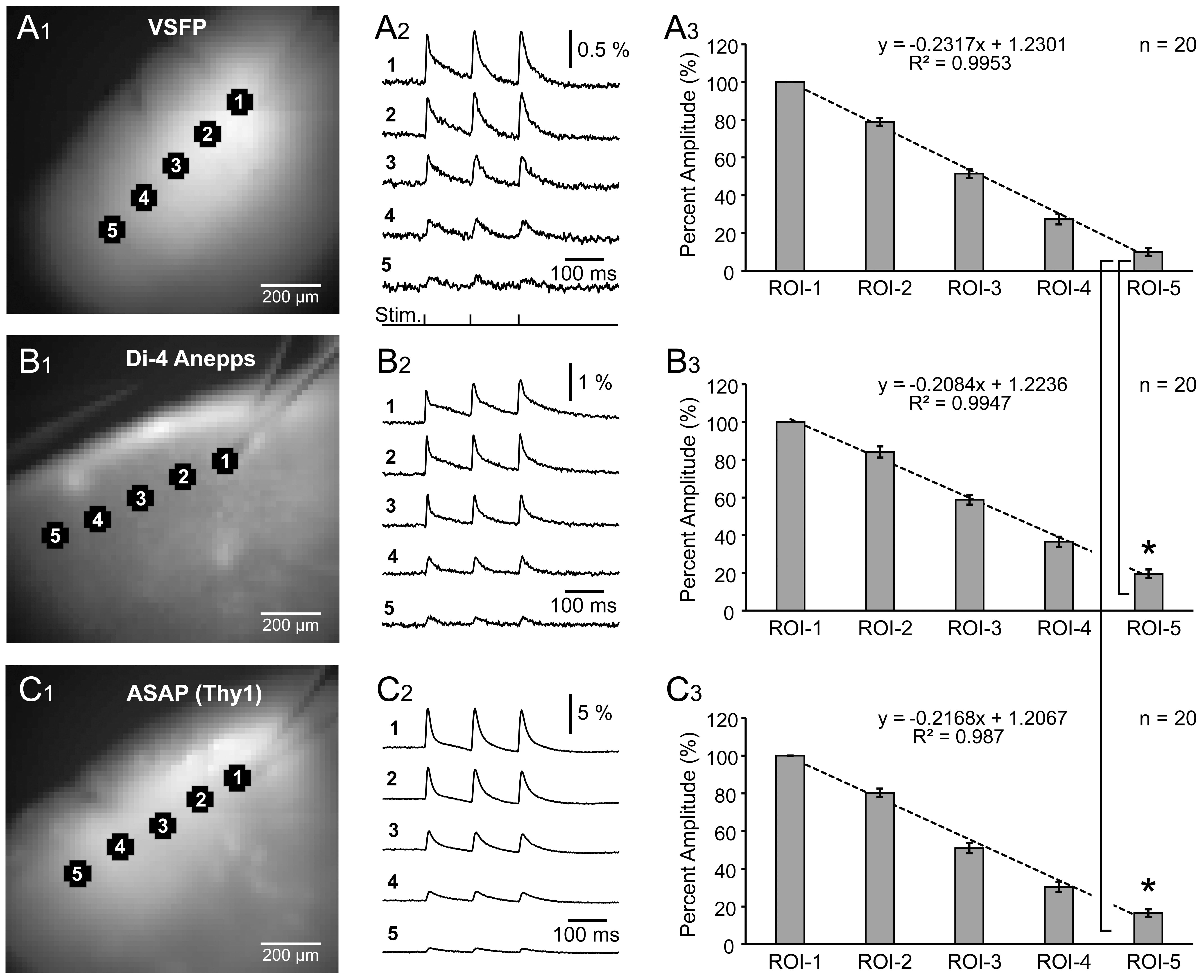 indicator (GEVI) variants, VSFP and ASAP. (A) Three synaptic pulses were