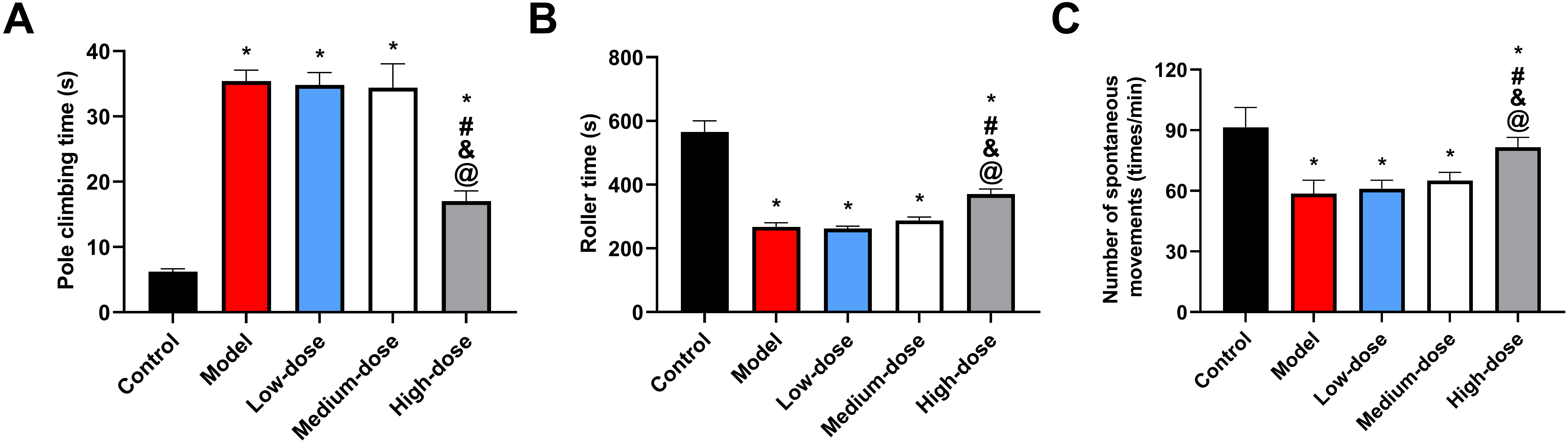 Pole-climbing test: The mouse was put on a rotarod, which was spun at a speed of 5 rpm/min–20 rpm/min for 180 seconds, and the time the mouse spent on the rotarod (latency) was recorded. The rotarod’s diameter was 9 mm, and its length was 1 m. The wooden pole was fastened vertically in the cage. Every half an hour, we ran the experiment again to get an average. In an open-field test, one mouse was given five minutes to explore a box that measured 50 by 50 by 40 centimeters and was outfitted with a camera to capture its every move. The number of times the mouse groomed itself and the number of times it stood up (meaning its front two legs left the floor or climbed a wall) were both noted. After each experiment, 75% alcohol was used to disinfect the testing area.