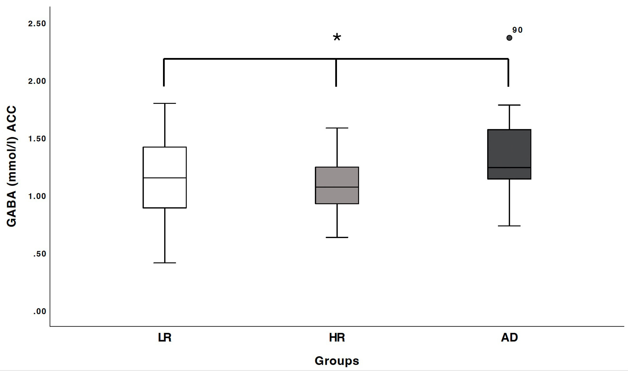 Statistical analyses were carried out using the Statistical Package for the Social Sciences (SPSS Statistics Version 29.0.0, IBM, Armonk, NY, USA). From the total sample size of 96 subjects GABA levels in the ACC were available for 92 subjects. Further, outliers were visually identified and consecutively excluded. We excluded two outliers in the LR, one in the HR and one in the AD group with a resulting sample size of 88 (LR = 28, HR = 35, AD = 25). After the exclusion of outliers’ normal distribution was achieved and statistically confirmed with the Kolmogorov-Smirnov Test.