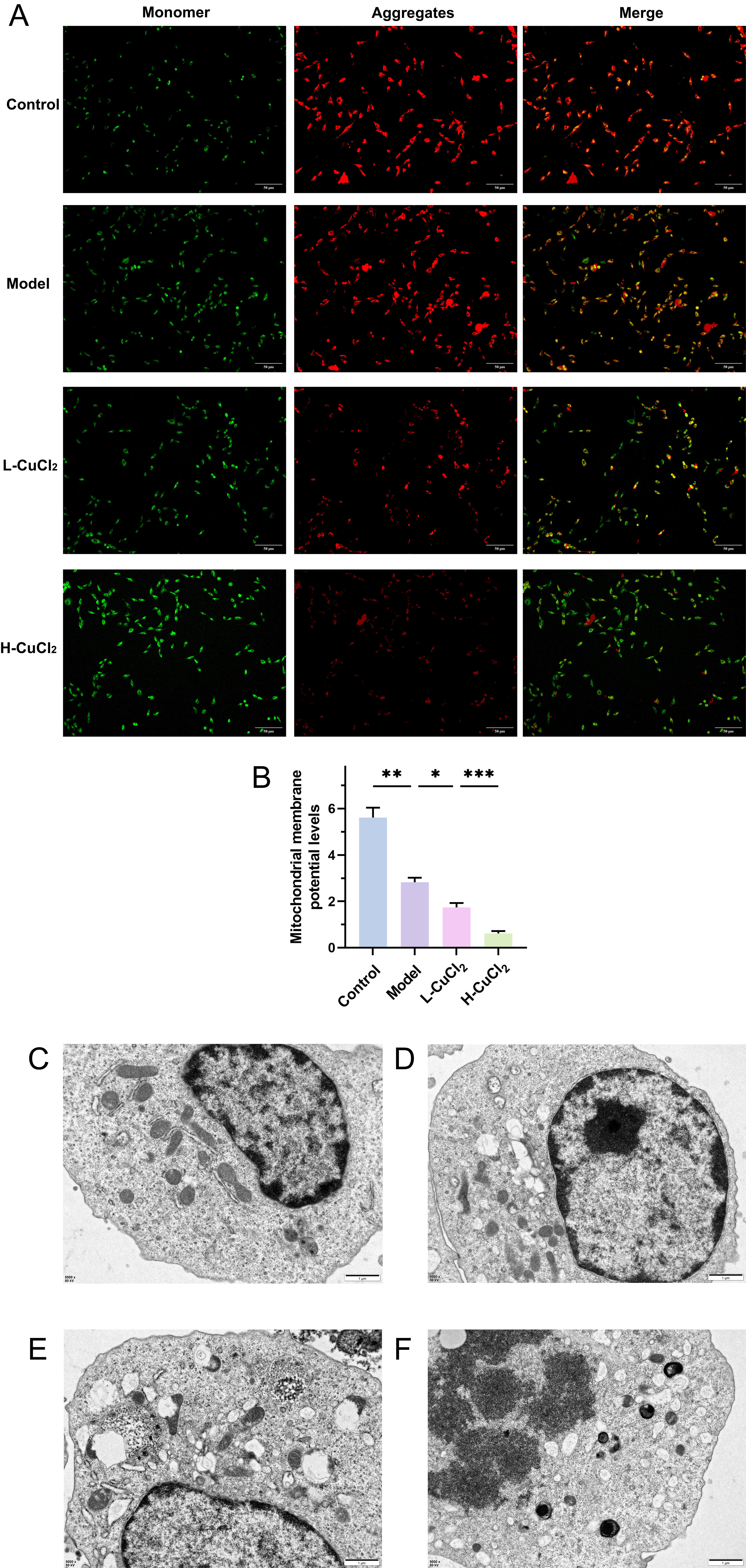 Mouse hippocampal HT-22 cells were cultured with Aβ1-42 oligomer for 24 h as AD Model group. CuCl2 treatment was administered to the AD cell model, and cell survivability levels were detected by Cell Counting Kit-8 (CCK-8), TdT-mediated dUTP nick end labeling (TUNEL), and other relevant kits. Mitochondrial function was evaluated using Mitochondrial membrane potential dye JC-1 and transmission electron microscopy (TEM). After intervention with the NLRP3 inhibitor MCC950, activation of the NLRP3/Caspase-1/GSDMD pathway by copper ions (Cu2+) was confirmed via Western Blot. Thioredoxin T (ThT) fluorescence assay was performed to observe the aggregation effect of Aβ induced by Cu2+ overload.