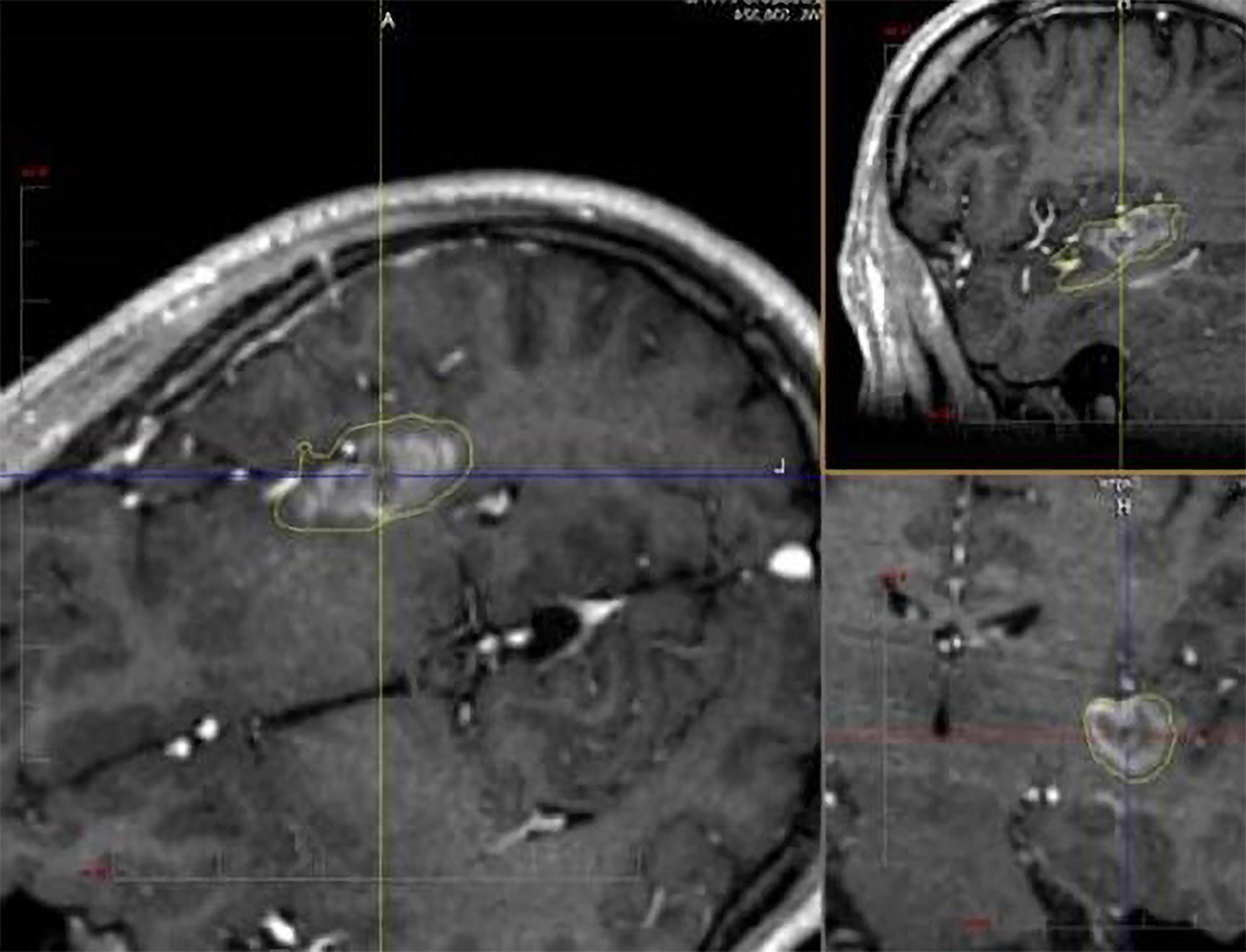 SEEG-guided laser ablation of the posterior insula in a patient with medically refractory epilepsy. The procedure was well tolerated and results in seizure freedom. SEEG, stereoelectroencephalography.