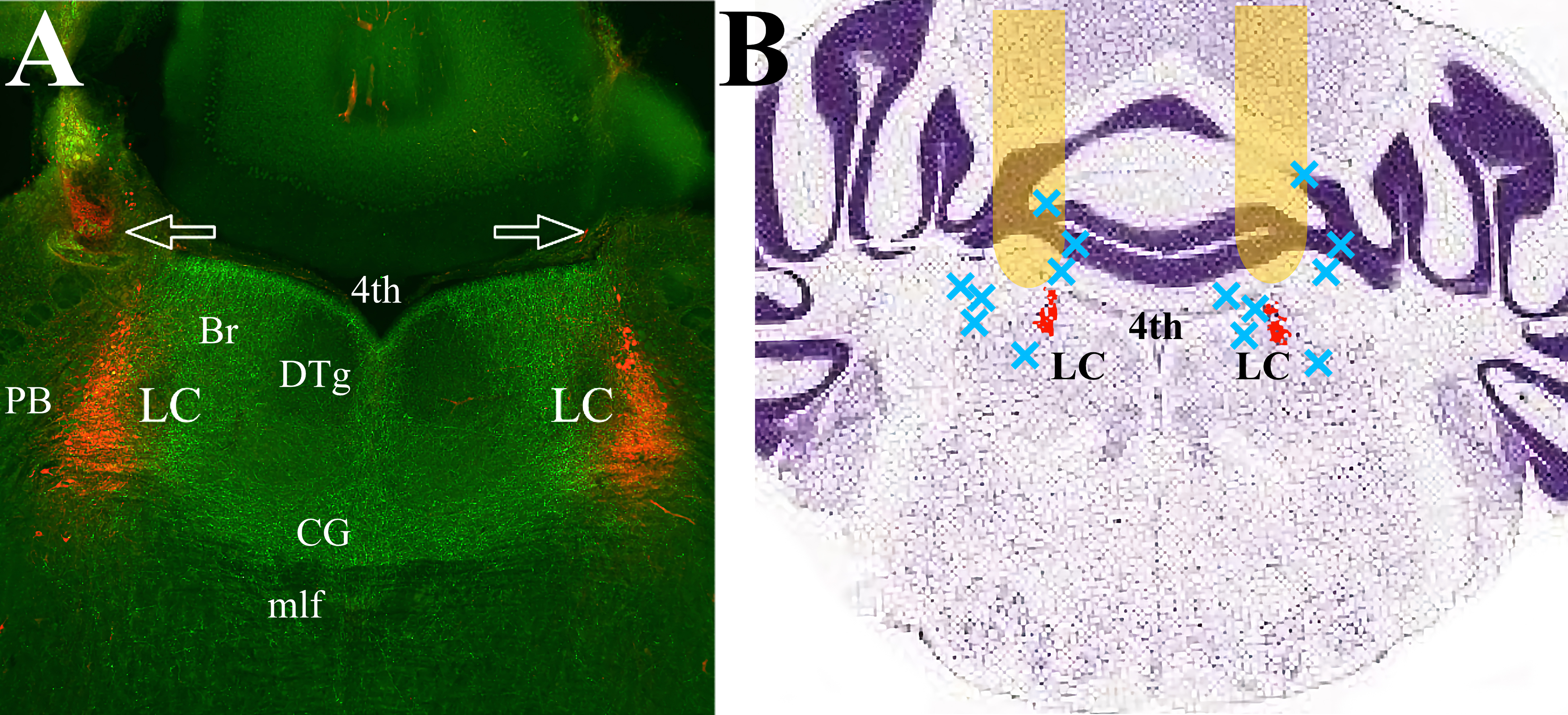 Fig. 1.mPFC efferents cover the pontine tegmentum, including LC proper and peri-LC area. (A) The mPFC efferents expressing ArchT (green) traverse LC (red) and adjacent dendritic regions on both sides. There is minimal expression in the lateral and ventral parts of the pons. Arrows indicate fiberoptic tracks. (B) Schematic representation of the placement of the optic fibers. Behavioral data was collected from twenty-three mice with fiber optic cannula tracks positioned in the yellow areas. Seven animals with placements at approximately the blue X marks were excluded from analysis. LC proper is highlighted in red. The Nissl-stained coronal brain section is adapted from “Allen Brain Atlas”, (http://atlas.brain-map.org/atlas?atlas=1&plate=100960184). Abbreviations: 4th, Fourth ventricle; Br, Barrington nucleus; CG, Central Gray; DTg, Dorsal Tegmental nucleus; LC, Locus Ceruleus; mlf, medial longitudinal fasciculus; PB, parabrachial nucleus; mPFC, medial prefrontal cortex.