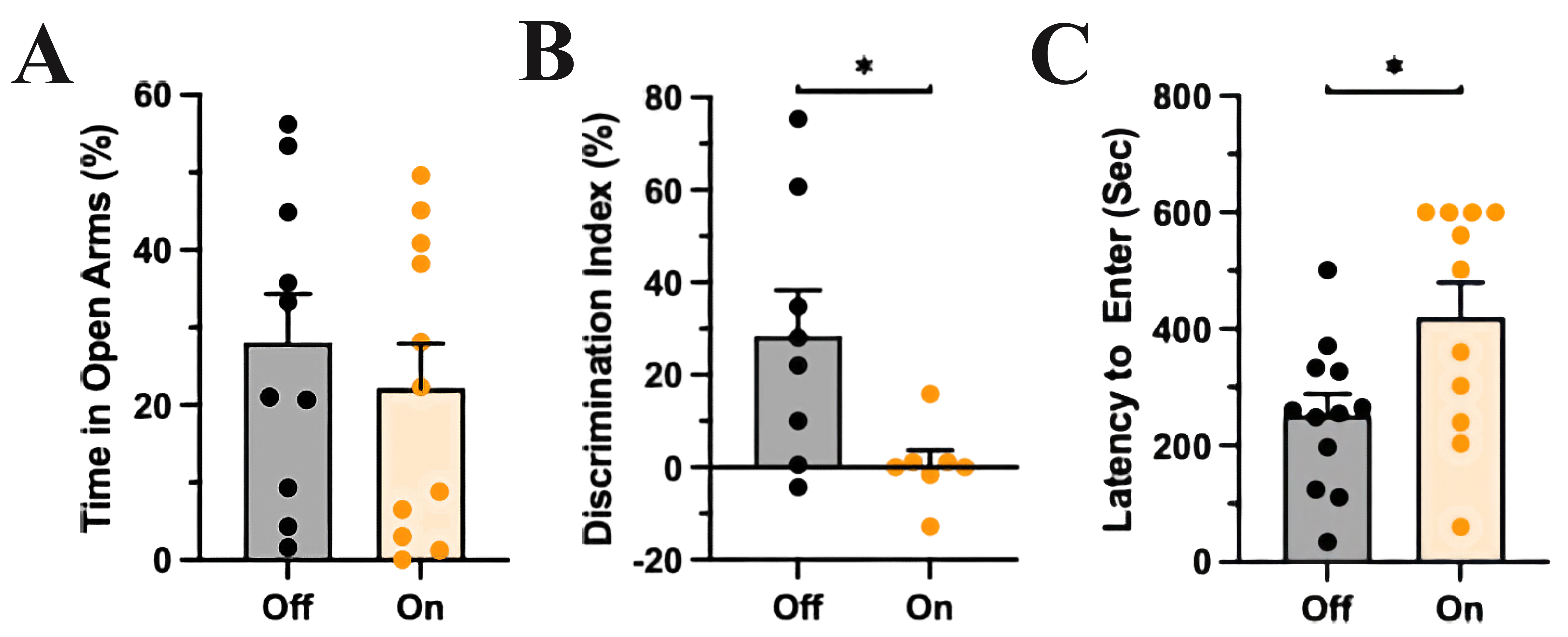 All behavior tests were done with mice implanted with optogenetic fibers attached to a light transmitter. The light transmitter was off in the control groups and switched on in the experimental groups, delivering yellow light. Behavioral tests were each separated by three to five days. The mice were randomly assigned to groups for different tests; therefore, each mouse had an equal chance to be in the control or experimental group.