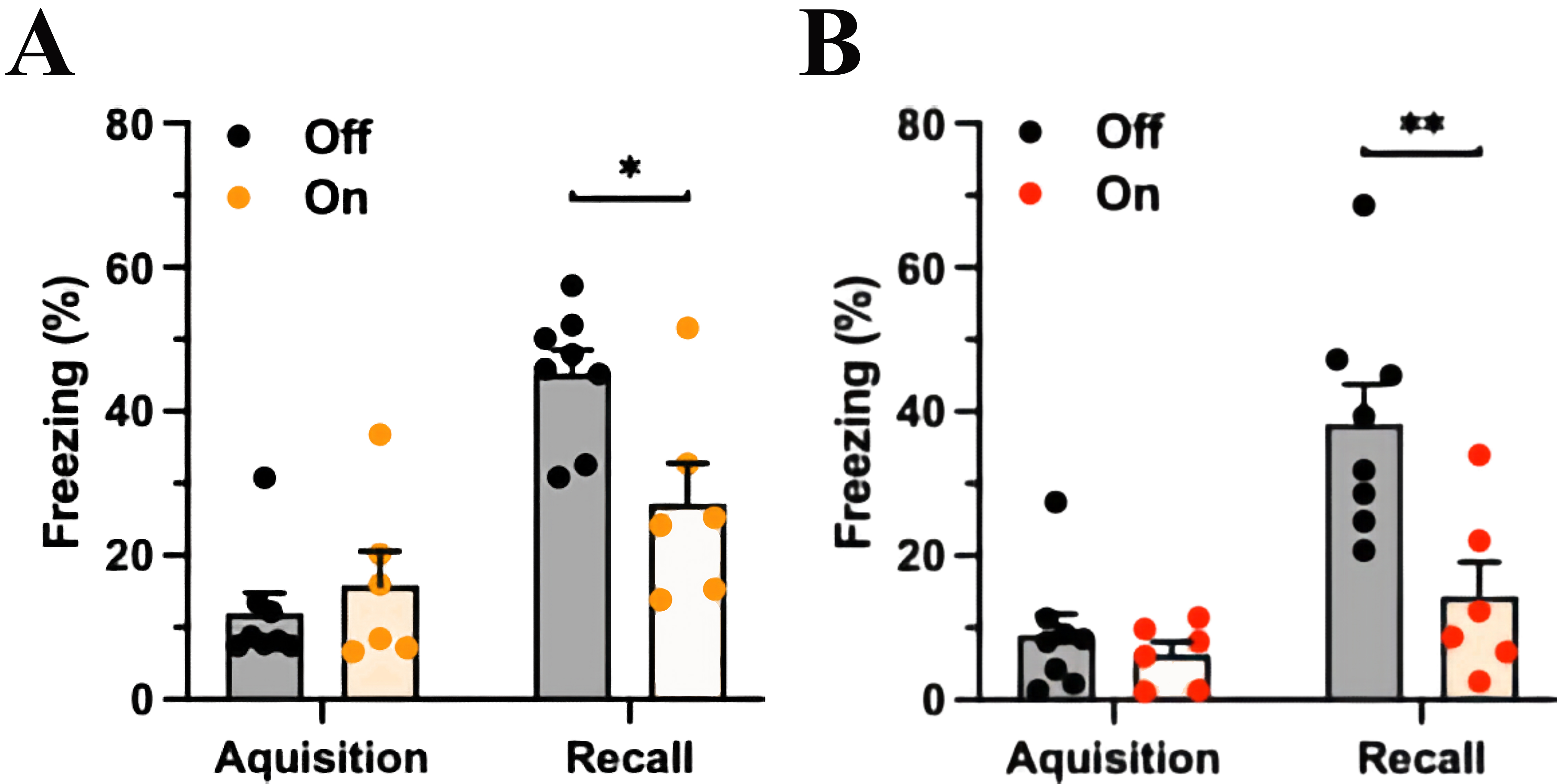 Two fear conditioning (FC) tests were performed using different groups of mice. In the first test, the yellow light was on during the acquisition phase (Box B) and off during the recall phase (Box A). In the second FC test, the light was off during the acquisition (Box B) and turned on in the recall phase (Box A). The control groups had mounted headgear, but the light transmitters were off for both phases of the experiment.