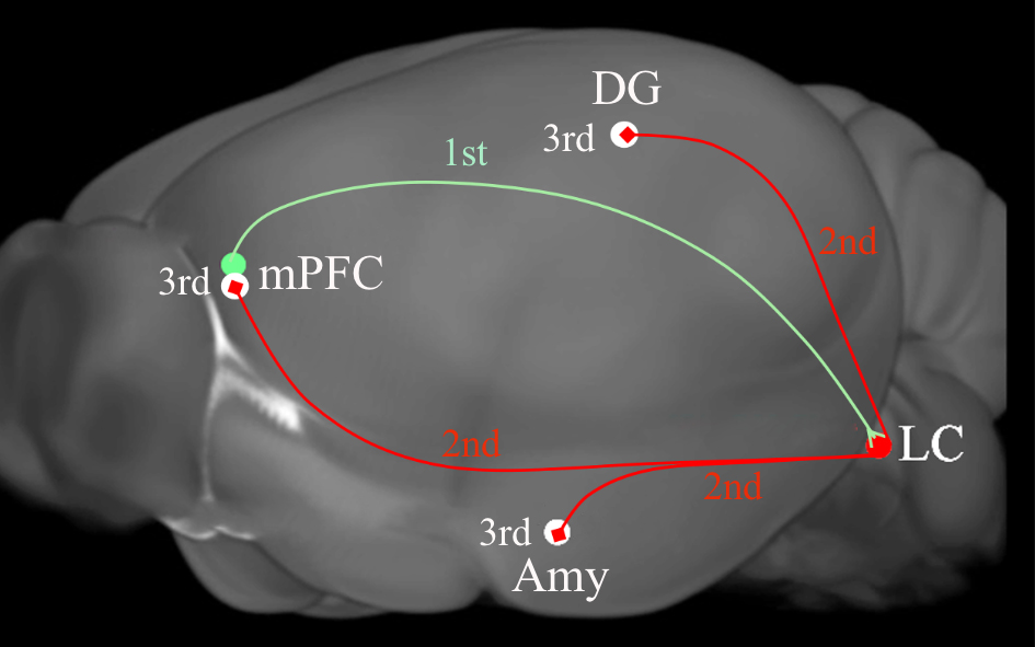 In summary, the study demonstrated the existence of continuous axonal pathways from the mPFC to the Amy, DG, and back to the mPFC via the LC. The mPFC-LC circuit is employed in distinct cognitive processes, such as learning, long-term memory, and problem-solving behavior, where mPFC regulation of LC activity is essential for optimal tuning of the NE release in the execution of memory tasks or solving a problem. In addition, this circuit is likely activated by intense stressors and participates in creating robust aversive memories by mPFC-mediated modulation of LC activity. This work may have far reaching implications for further investigation into the possible role of mPFC-mediated NE release in Post-Traumatic Stress Disorder (PTSD), obsessive ruminations, memory loss, and other cognitive impairments.