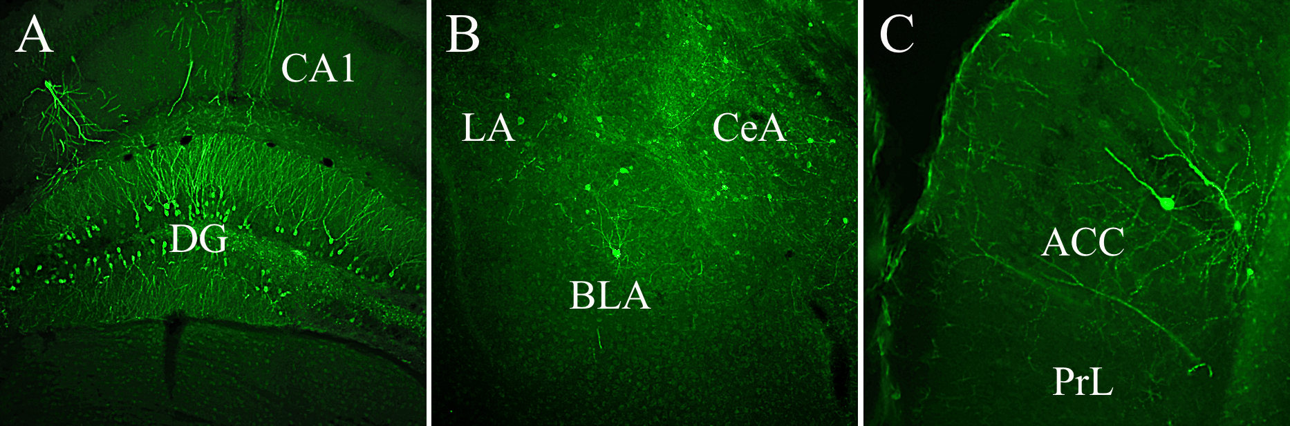 Fig. 5.Third-order GFP labeled neurons were expressed by different limbic structures demonstrating continuous, tripartite circuits connecting mPFC to LC and LC to DG, Amy, and mPFC. (A) GFP-labeled cells occupy both blades of the DG, (B) lateral (LA), central (CeA), and basolateral (BLA) subnuclei of the Amy, and (C) the anterior cingulate cortex (ACC). Abbreviations: CA1, field of the hippocampus; PrL, prelimbic cortex; GFP, GCaMP6.