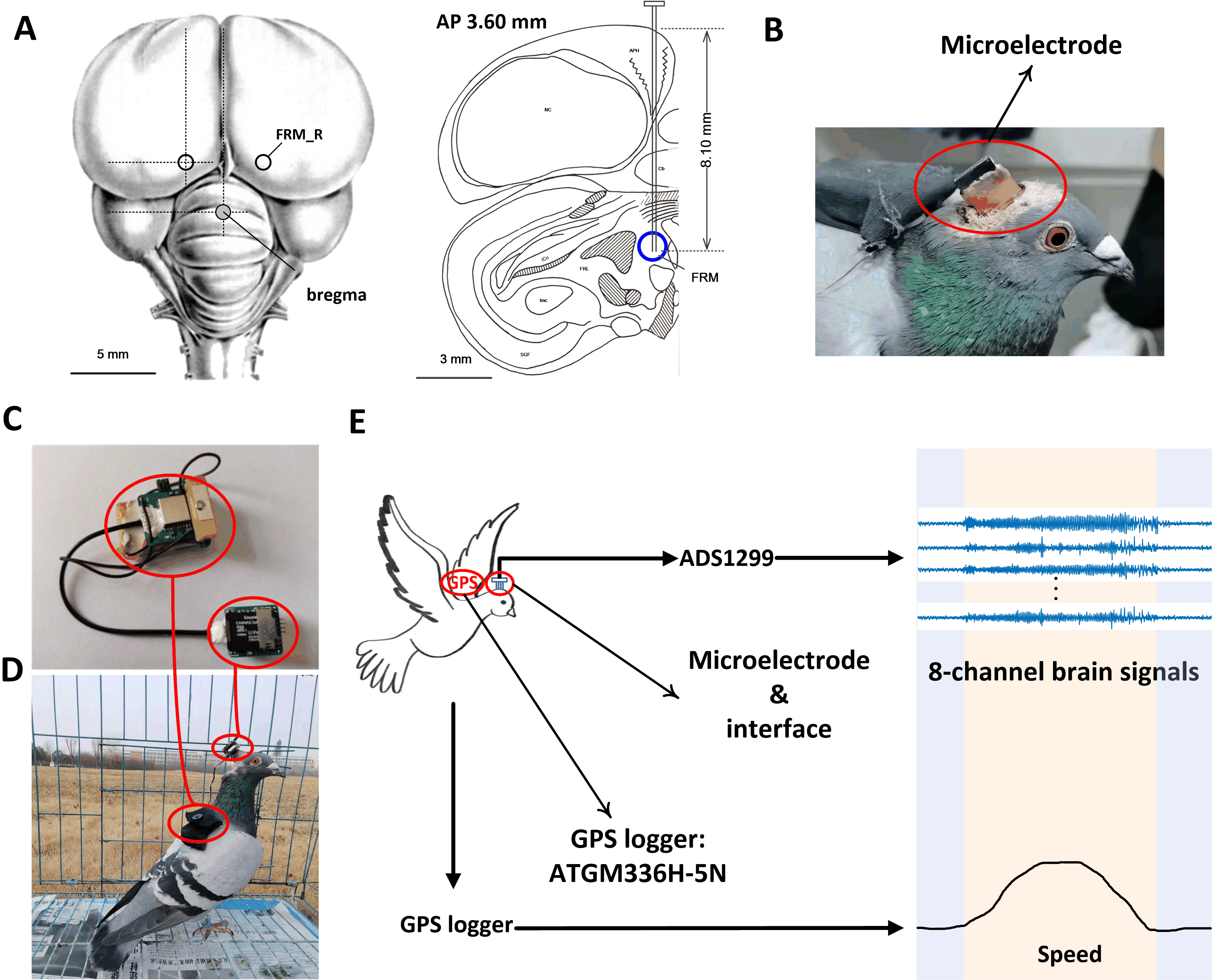 Fig. 1.Electrode implantation and data acquisition. (A) Location of microelectrode implantation. (B) Pigeon implanted with a microelectrode array. (C) Wearable data recording device. (D) Pigeon wearing the data recording device. (E) Diagram of data recording during free flight, in which the 8-channel LFP signals and the GPS data were recorded. AP, anteroposterior; FRM, formation reticularis medialis mesencephali; GPS, global positioning system; LFP, local field potential.