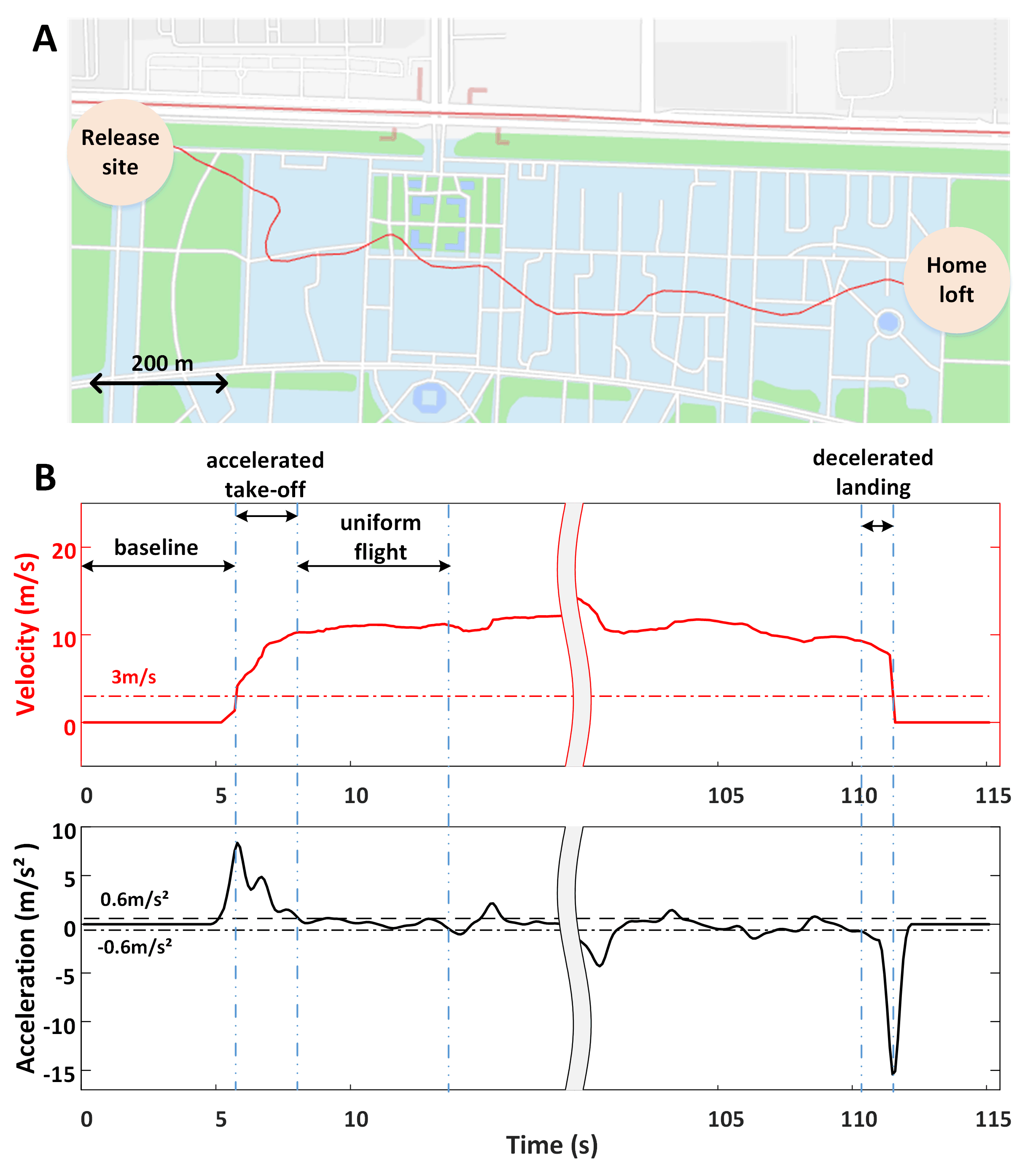 Fig. 2.Recorded GPS track and definition of typical states. (A) The track is displayed on the map, where the red line indicates the actual flight route from the release site to the home loft. (B) The velocity and acceleration curve calculated after pre-processing the GPS data, in which the solid red line represents the change of speed, and the solid black line represents the corresponding change of acceleration, marking four typical motion states based on the velocity and acceleration curves.