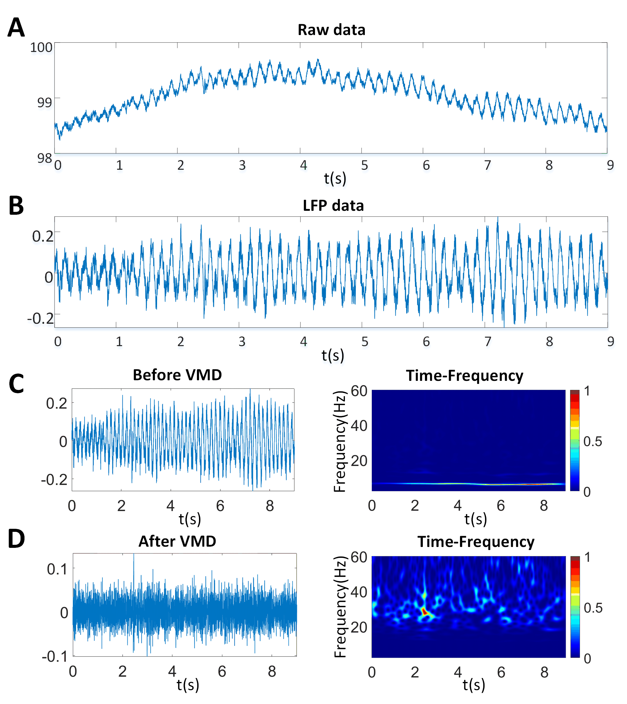 Fig. 3.Neural signal pre-processing. (A) Raw neural signals. (B) LFP signal processed to remove baseline drift by wavelet technology. (C) LFP signals before VMD in time and time-frequency domain. (D) The LFP signals after VMD in time and time-frequency domain. VMD, variational modal decomposition.