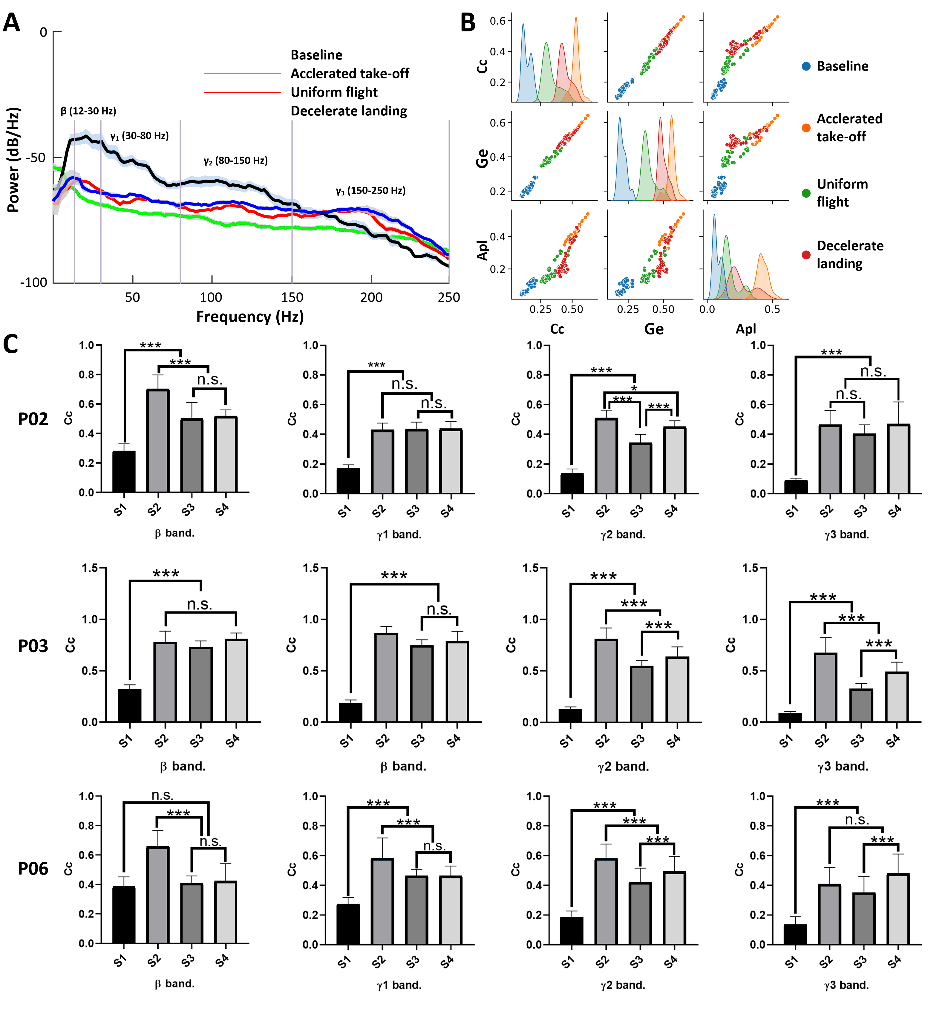 We effectively collected the data of three pigeons (P02, P03, and P06), while three other animals (P01, P04, and P05) dropped out of the study due to electrode implantation failure or poor signal quality. The pigeons were released from a location about 2 km away from the loft, and one whole flight process recorded by GPS data of P02 is shown in Fig. 2A. The speed and acceleration information of pigeons was calculated based on the GPS data to better characterize their specific states. Four typical motion states including baseline, accelerated take-off, uniform flight, and decelerated landing were then defined according to the above calculations, which are shown in Fig. 2B.