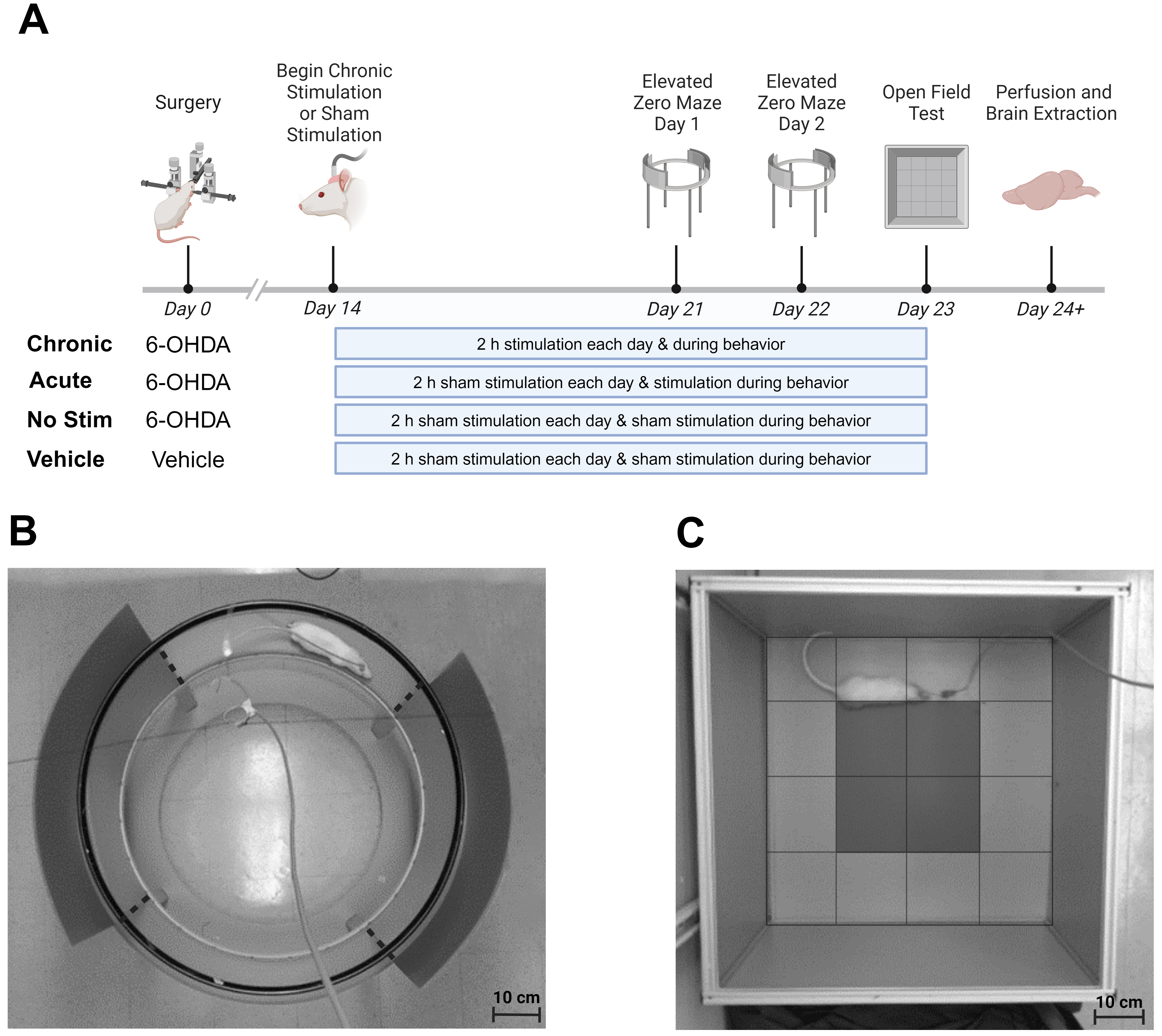 Fig. 1.Experimental approach. (A) Experimental timeline and test groups. Surgery to induce dopaminergic 6-hydroxydopamine (6-OHDA) lesioning or vehicle injection and deep brain stimulation electrode implantation was performed on day 0. Sham and chronic stimulation (when appropriate) began on day 14 and continued until day 23. Behavioral analysis using the elevated zero maze was performed on day 21 and again on day 22. The open field test was performed on day 23. Perfusion was performed following completion of all behavioral tests. (B) Elevated zero maze setup. Rats that spent more time in the closed arms exhibited behavior associated with anxiety and fear, while rats that spent more time in the open arms were considered less anxious and more willing to explore open environments. Dashed lines indicate the areas where the closed and open arms intersect and are used to quantify exploratory behavior. (C) Open field test setup. The shaded region indicates the center of the field used to quantify exploratory behavior. Anxious rats spent less time in the central, shaded, and more exposed areas of the field. The open field test was also used to quantify total distance traveled as a measure of locomotor function.
