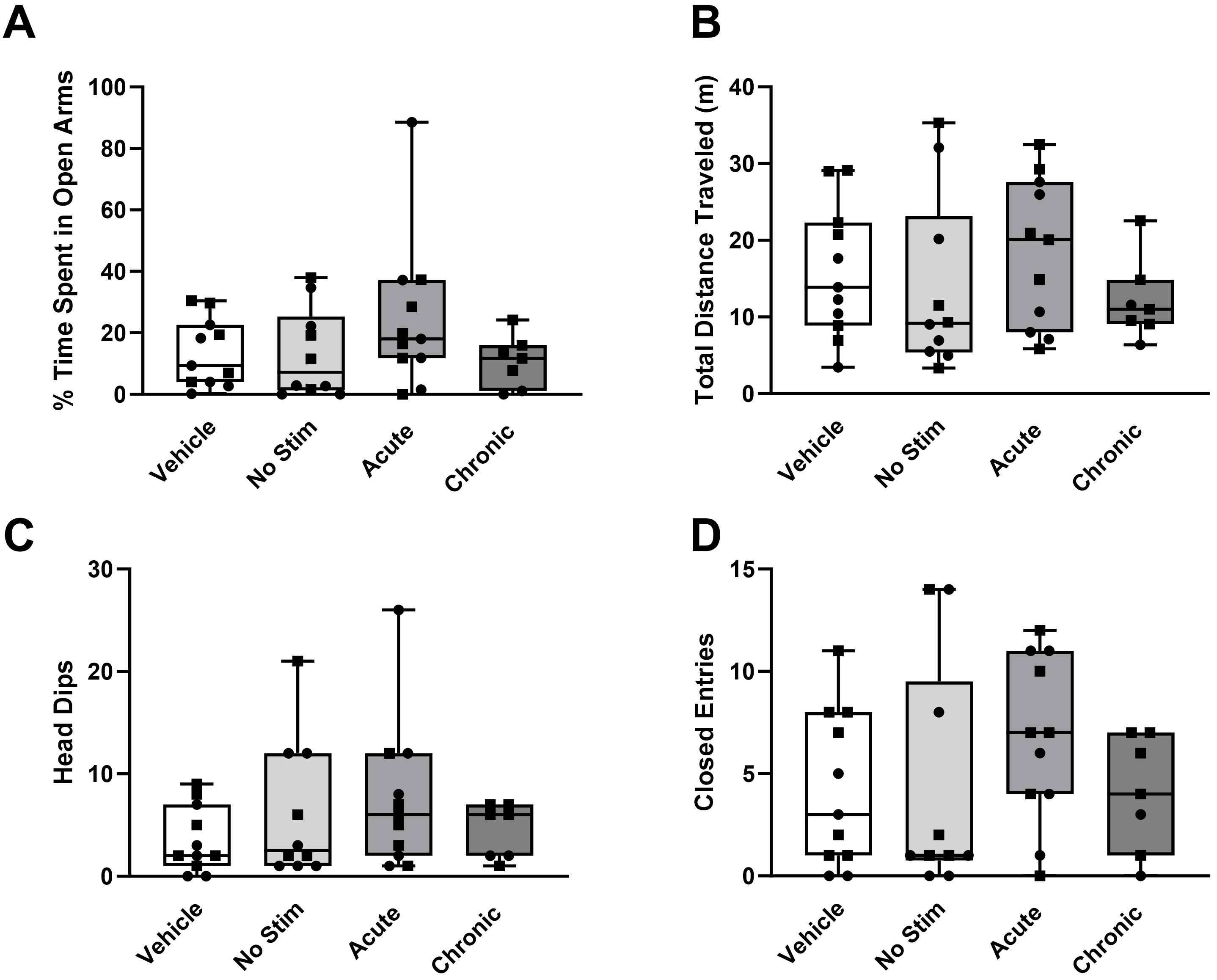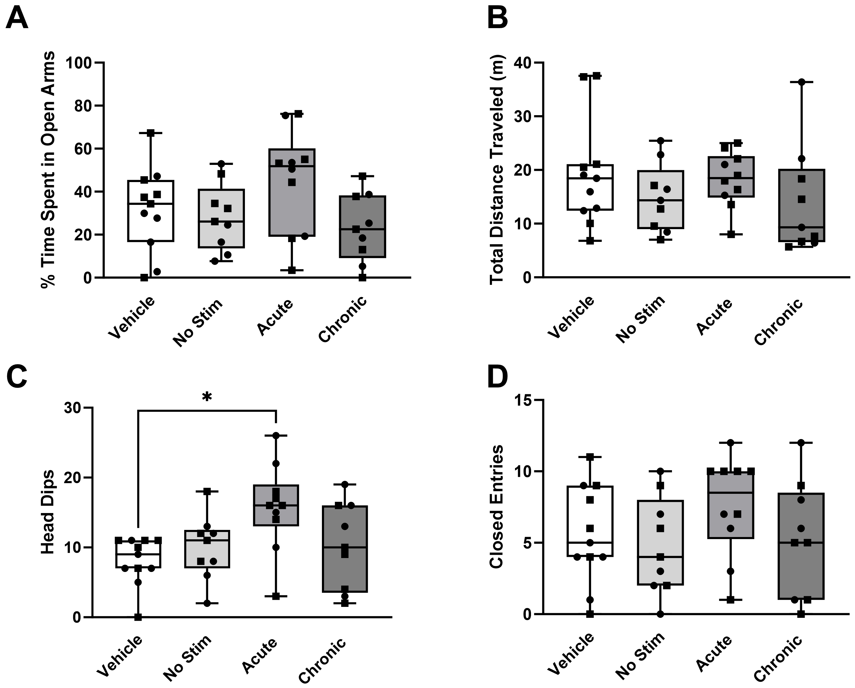 We quantified the percentage of time spent in the open arms of the elevated zero maze for all experimental groups. The chronically stimulated group had a median time spent in the open arms of 22.57%, while the acutely stimulated group had a median time spent of 51.83% (Fig. 2A). No statistically significant difference was observed between any of the experimental groups (H = 5.62, p = 0.132). Additionally, there were no significant differences in the total distance traveled (Fig. 2B, H = 3.89, p = 0.273) or closed arm entries (Fig. 2D, H = 3.80, p = 0.284) between the experimental groups. However, the acutely stimulated group showed significantly more head dips (Fig. 2C, p = 0.017) compared with the vehicle group.