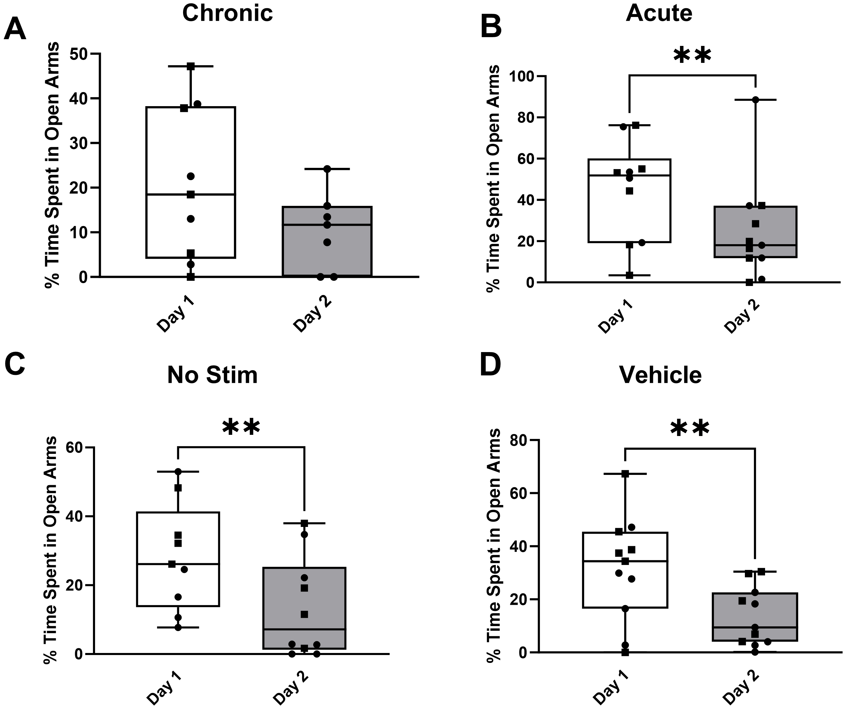 Notably, significant decreases in the median percentage of time spent in the open arms were observed for rats in the acute stimulation group (W = –55.0, p = 0.002) from 51.83% to 18.00%, the no stimulation group (W = –43.0, p = 0.008) from 26.13% to 7.20%, and the vehicle group (W = –60.0, p = 0.005) from 34.37% to 9.40% (Fig. 4B–D, respectively) after 1 day of prior exposure to the maze. In the open field test, there were no significant differences in the percentage of time spent in the center of the open field (Fig. 5A, H = 2.38, p = 0.498) or total distance traveled (Fig. 5B, H = 1.47, p = 0.689) between the experimental groups. The results for both the elevated zero maze and the open field test remained consistent when accounting for the sex of the animal (Supplementary Figs. 1–6).