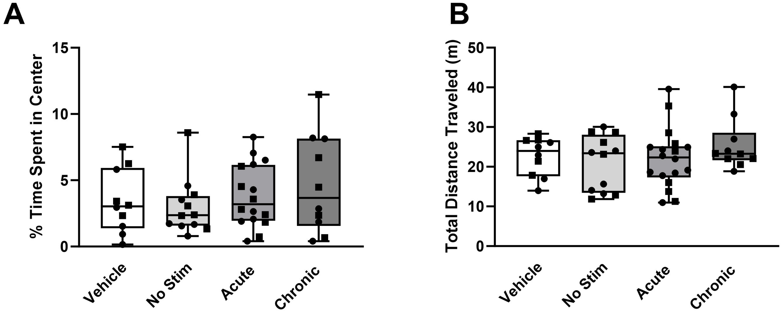 Fig. 5.Risk-avoidant behavior during the first 5 minutes in the open field test. Risk-avoidant behavior during the open field test for each of the experimental groups: chronically stimulated (n = 11), acutely stimulated (n = 16), lesioned but not stimulated (n = 12), and non-stimulated vehicle controls (n = 10). Stimulation did not evoke significant changes in (A) percentage of time spent in the center of the field (H = 2.38, p = 0.498), or (B) total distance traveled (p = 1.47, H = 0.689) compared with rats that did not receive subthalamic nucleus deep brain stimulation. Data are presented using box and whisker plots, the median is denoted by the line inside the box, and the box edges signify the lower (25%) and upper (75%) quartiles. Squares represent female rats and circles represent male rats. Significant changes in risk-avoidant behaviors compared with rats who were not stimulated. A p value of 0.05 was considered significant using the Kruskal-Wallis test.